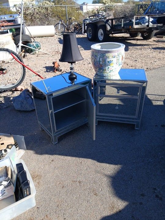 Matching mirror end tables with Chinese pot and lamp, get em all for 25 bucks