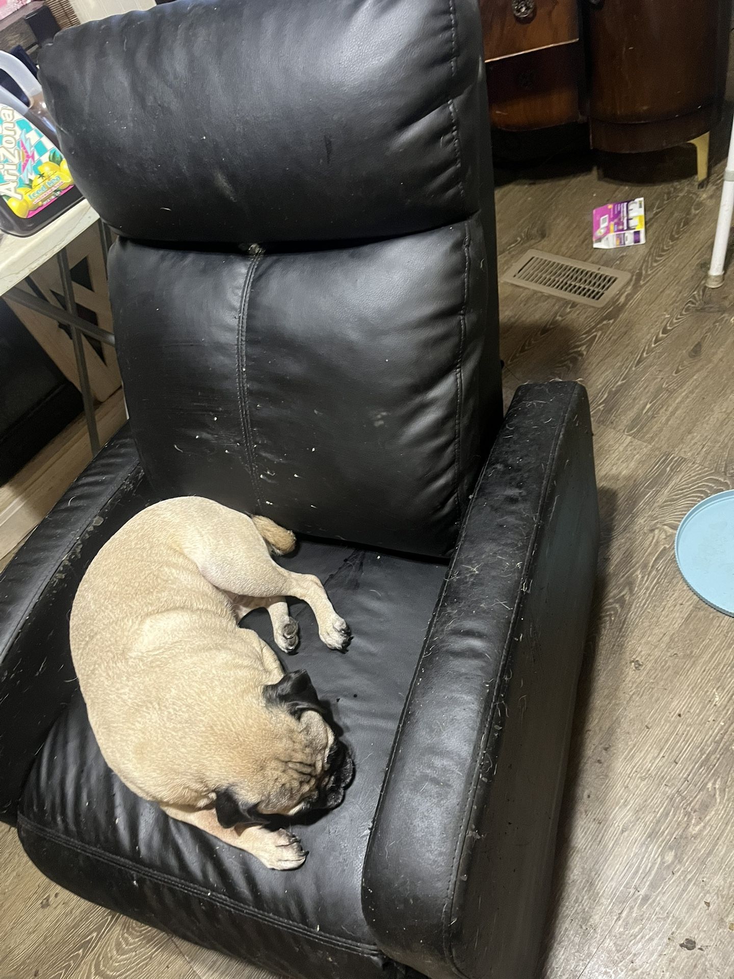 I have a recliner for sale, pug not included. It belonged to my mom who passed away, need to make room in the house. It’s used and needs some cleaning. It has a built-in massager Asking $20 for it. Must pick up.
