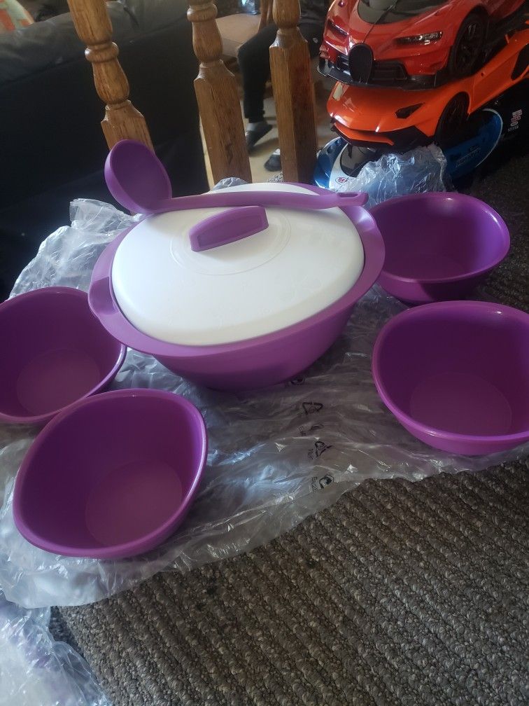 set Tupperware nuevo incluye sopera con cucharon y 4 tazoncitos nuevos