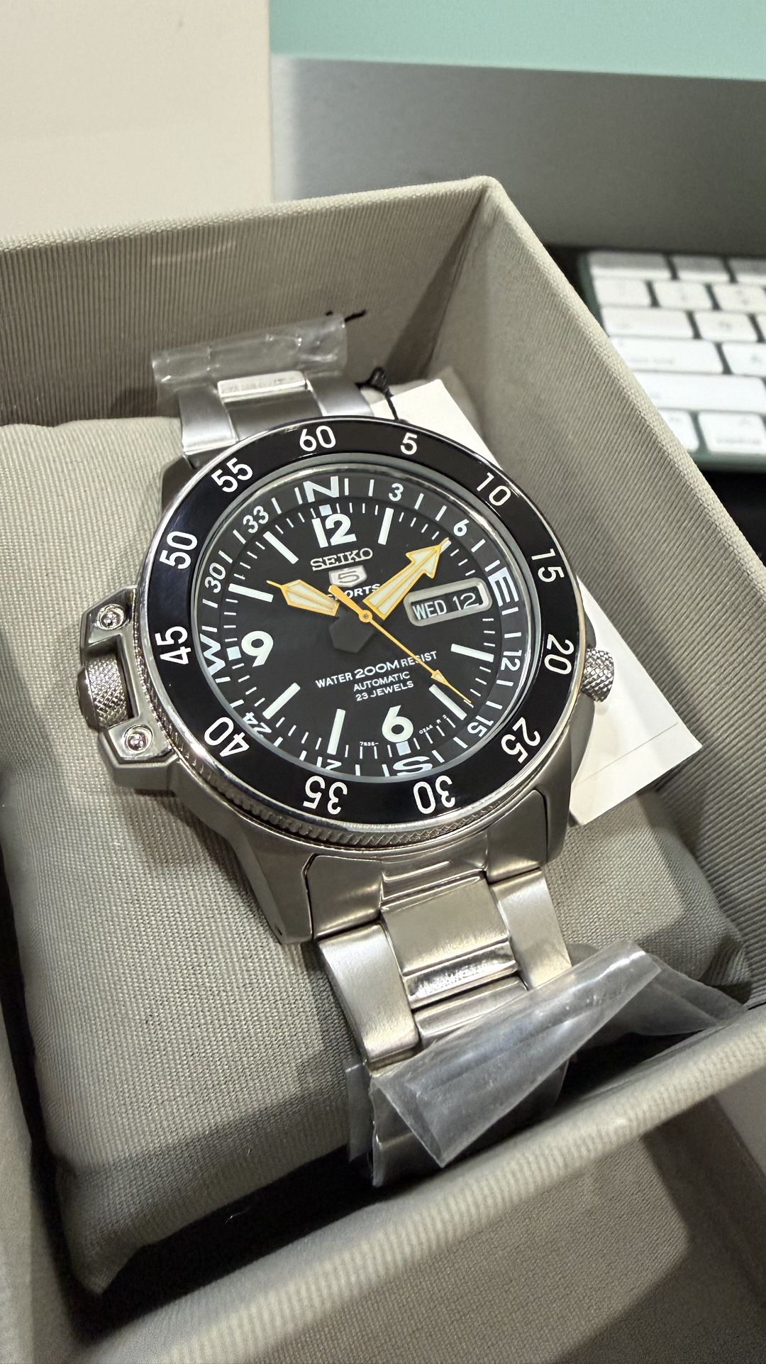 This tank of a watch is known as the Atlas or the Land Shark. It’s meant for bigger wrist or those you like some major wrist presence. It’s discontinued and a collectors piece. This watch has never been worn outside. It’s essentially New Old Stock kept in a closet with hang tag and original plastic on bracelet. Includes the original box. Not as famous as the Monster or the SKX007 but it has a following with many YouTube reviews. Has the dependable 7S36 automatic movement, inner rotating compass, unidirectional bezel and screw down crown. It’s honestly some of the brightest loom i’ve seen even for a Seiko. This 42mm beast sits comfortably on my 6.5” wrist. With 40 hours of power reserve and 200m or water resistance it’s ready to go everywhere you go. Once this is gone, it’s gone. I’m a collector and not desperate to sell. I am willing to consider reasonable offers, even trade or trade up and pay on top for another worthy luxury timepiece.