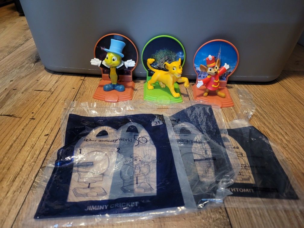Disney 50th Anniversary McDonalds Toys Sold together for $10 total Simba, Timothy, and Jiminy Cricket Comes with original bags I live just north of Disney property for reference