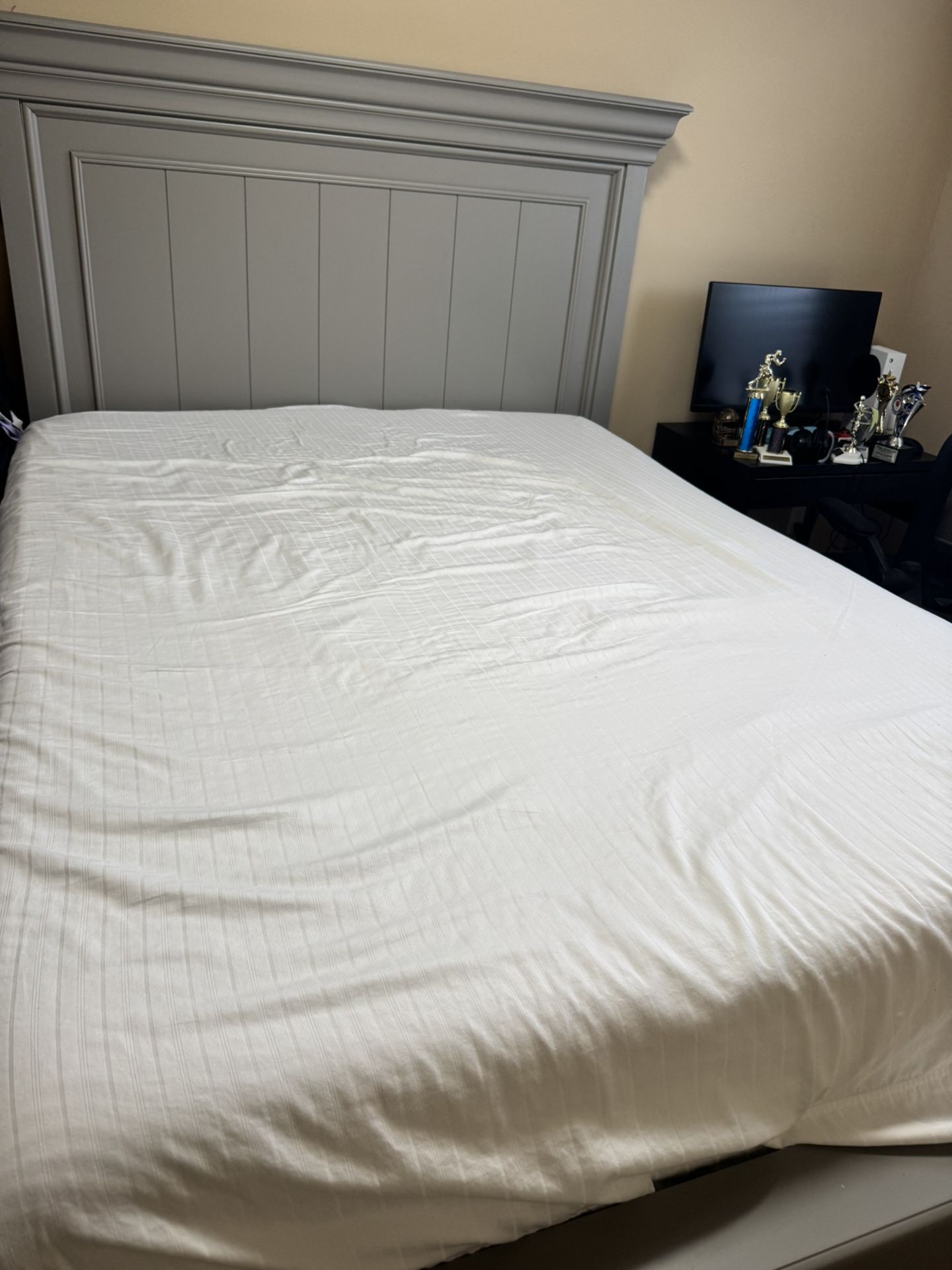It’s a gray color Queen size bed with storage, it’s like new, hardly used. It comes with Brand new mattress. It also comes with 2 big storage drawers. I am selling because my son wants twin size bed. It’s smoke free home and I don’t have any pets.