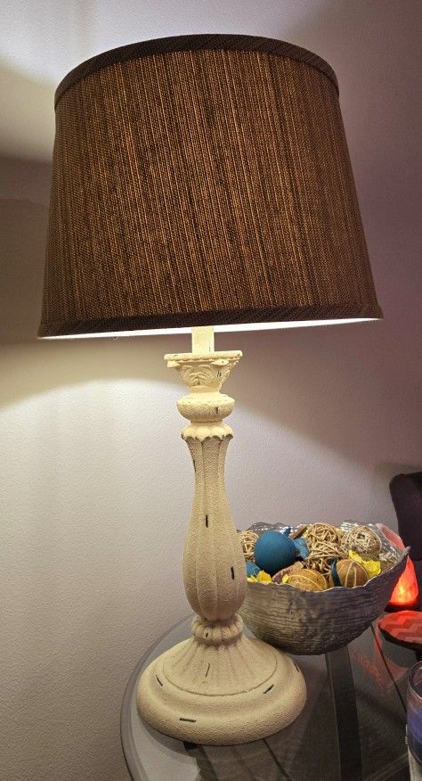 2002 8.5" base x 27" h Textured and factory distressed cream white Used lampshade not available. New shade for addl 10$ (see last pic) Must pickup