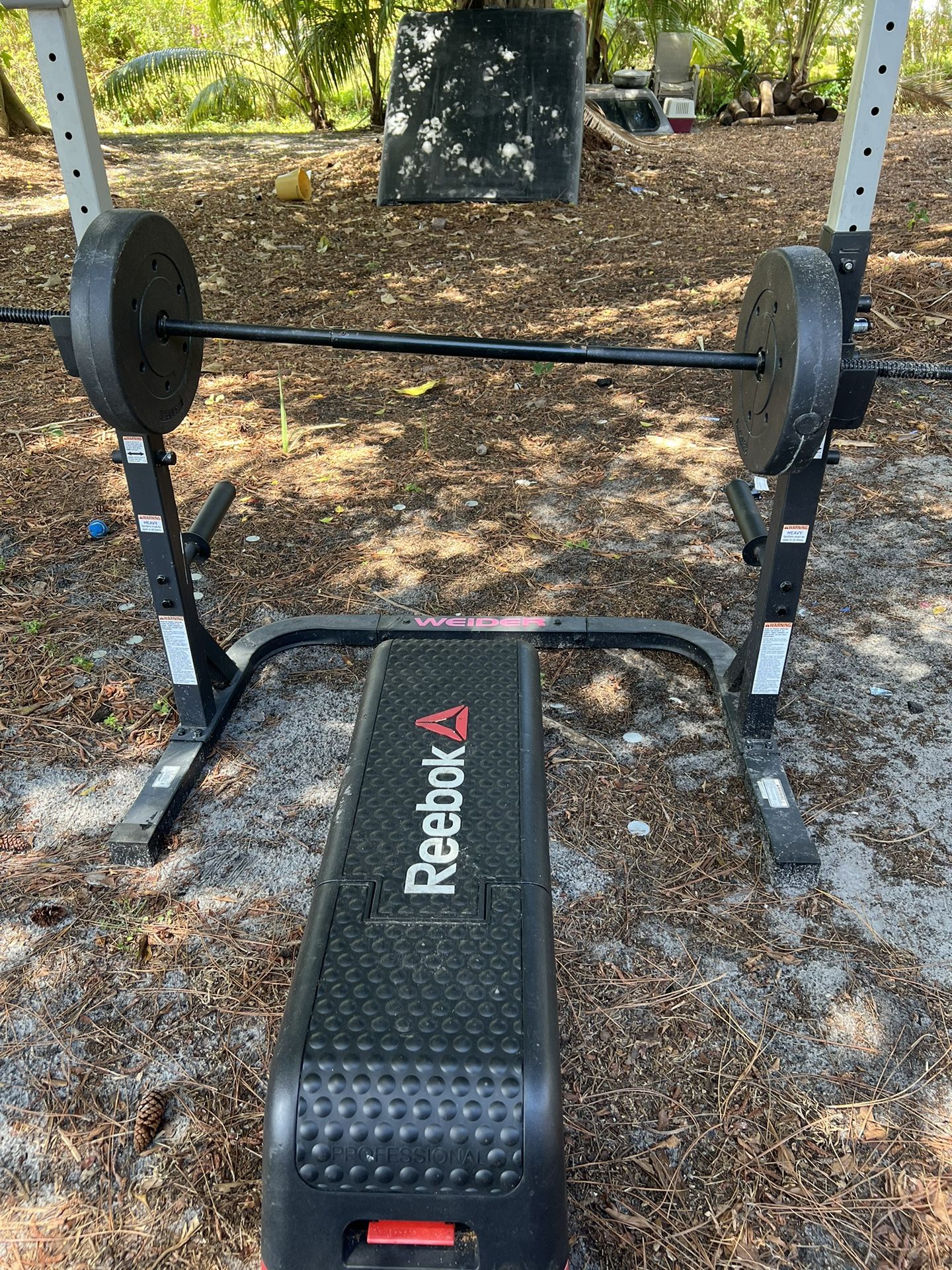 Includes bench, barbell, 2x 20 weights, and squat rack.