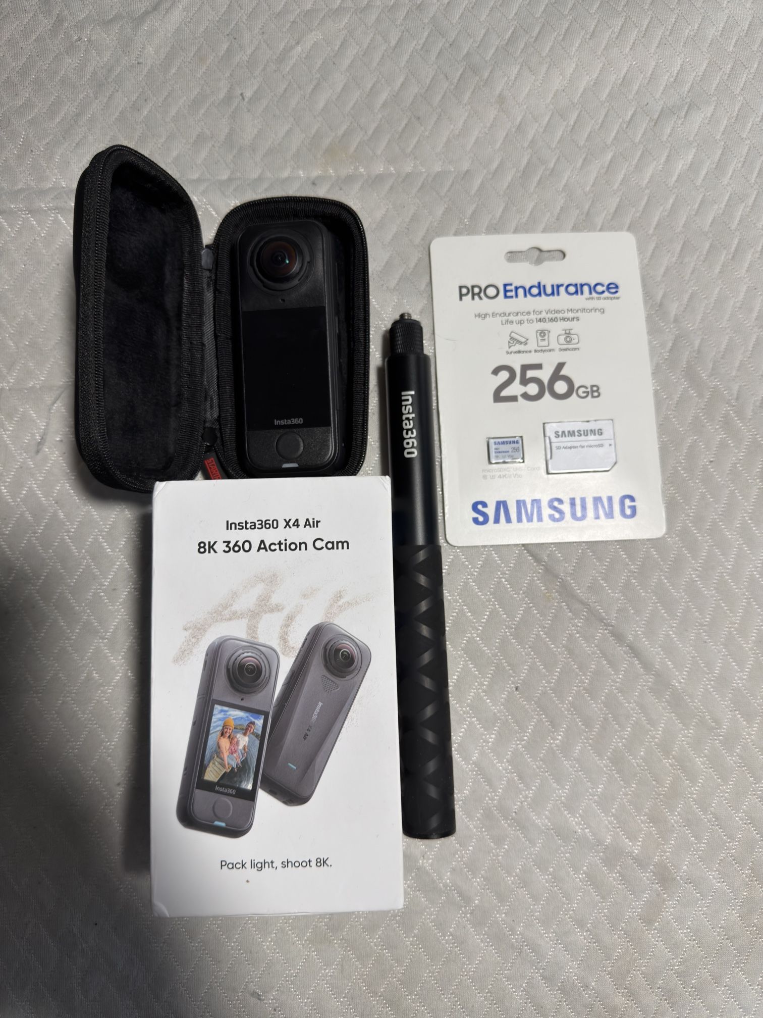 Insta 360 x4 Air. Used like 2 times. Come with invisible stick and 256gb Samsung SD card and camera cover. 360 firm