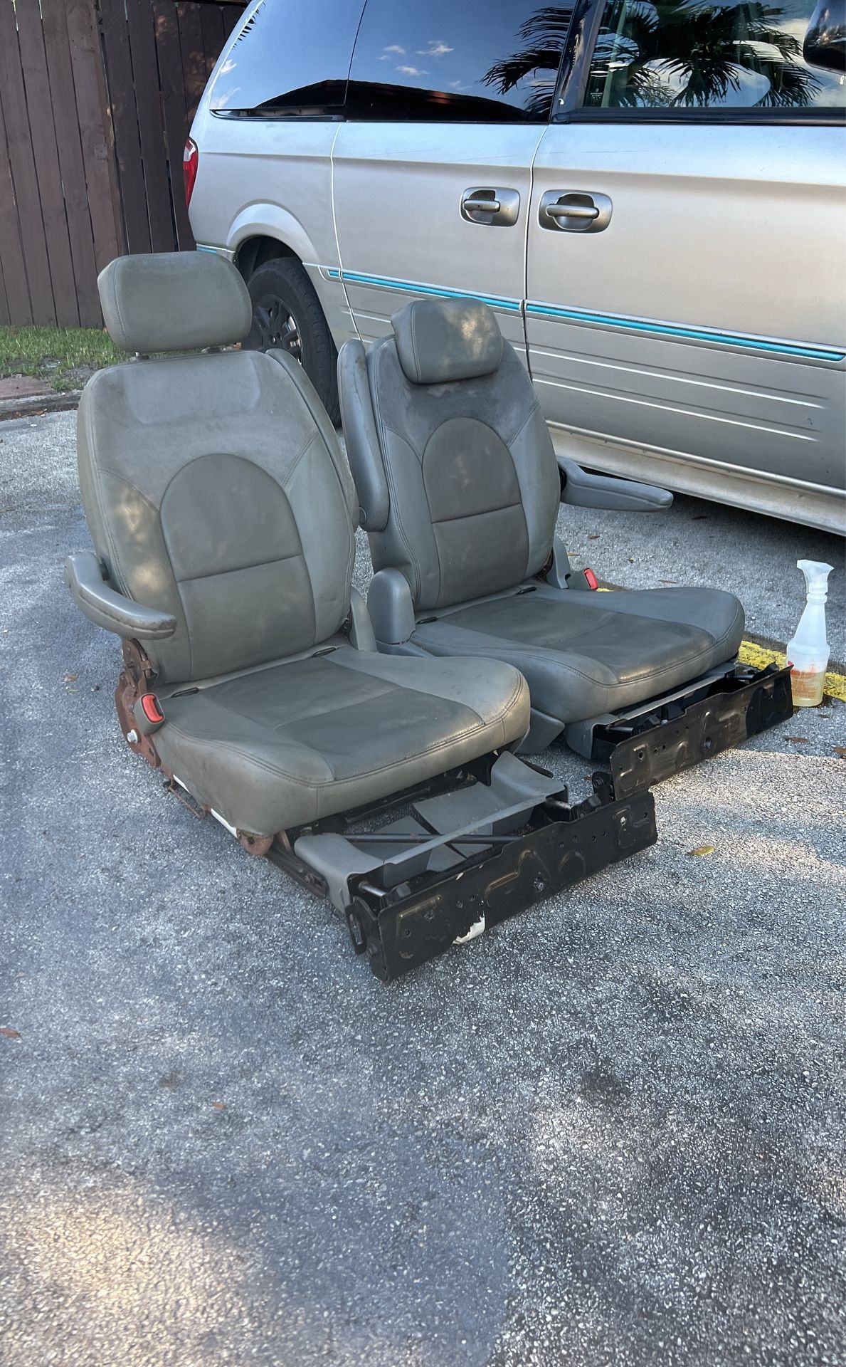 Gray leather everything’s good on them is need to be cleaned up a little bit but they’re full gray leather very comfortable headrest go up and down and the armrest go up and down and they lay flat on the floor. Good for a hot rod build.