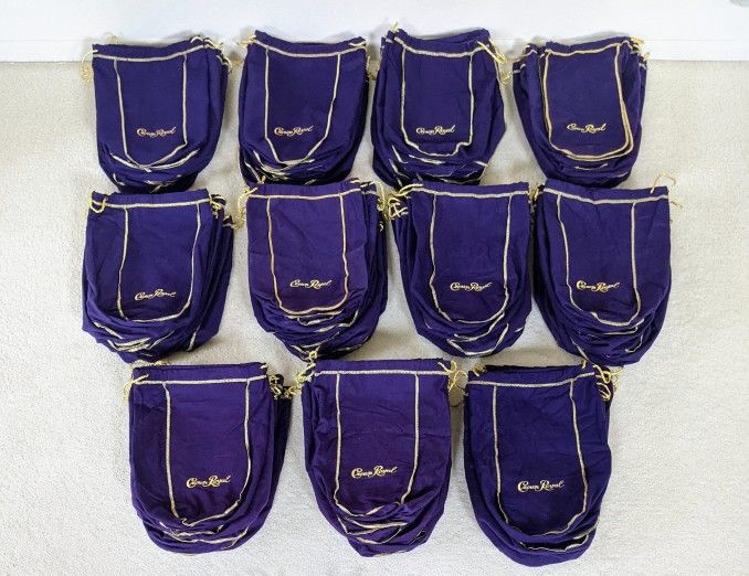 Soft, felt, cloth Crown Royal (whiskey) collectible purple bags with gold stitching and drawstring. Size: 1.75 liter bags, 13” x 9” x 4”. 100 bags for sale, as follows: 10 Crown Royal bags for $10 25 Crown Royal bags for $25 50 Crown Royal bags for $40 100 Crown Royal Bags for $70