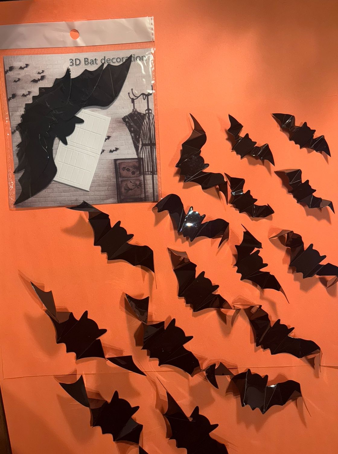 3D Halloween Bats come in 4 Different Sizes. Please see Photo for more details. Package contains 16 Pieces, comes with Double Sided Adhesive Pads Easy to Apply and Remove Material is waterproof Suitable for Walls, Windows, Door, and other Hard Surfaces