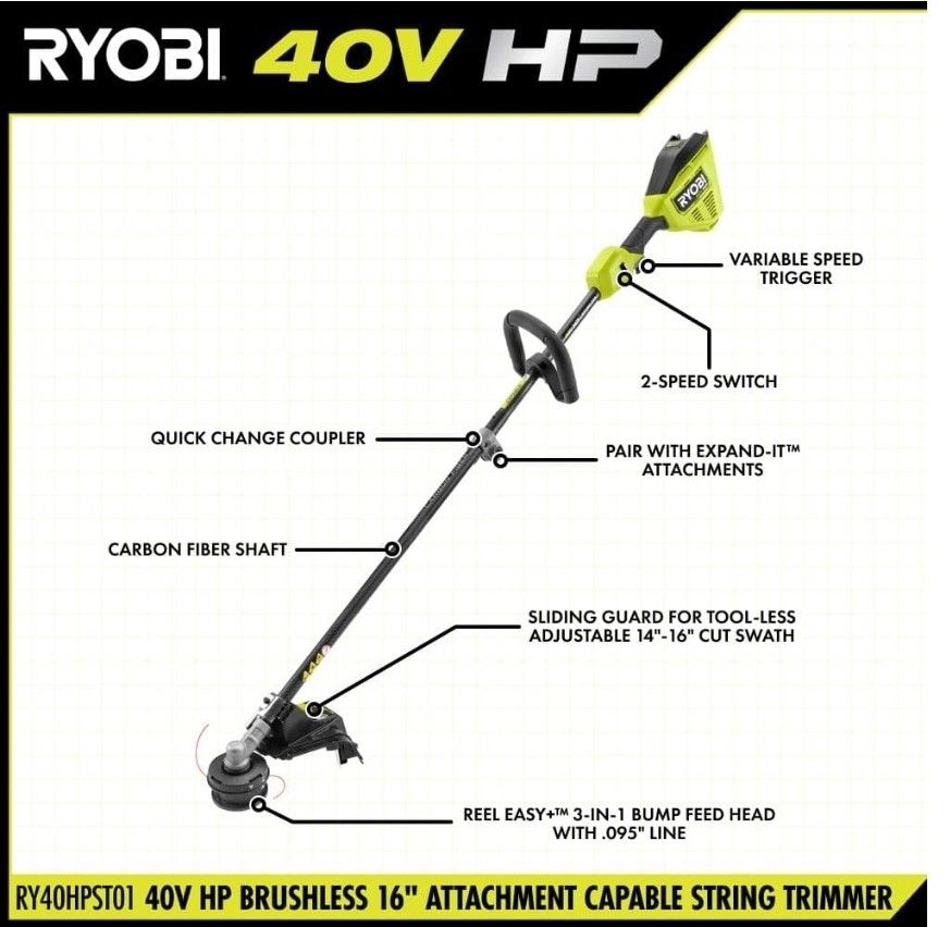 RYOBI 40V HP Brushless 16 in. Cordless Carbon Fiber Shaft Attachment Capable String Trimmer