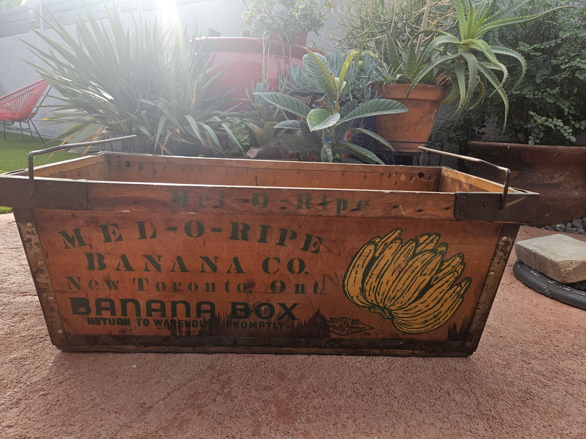 Rare extra large vintage metal and wood banana crate box made by The Chicago Mill & Lumbet Co. for Mel-O-Ripe Banana Co. New Toronto, Ontario - with metal handles and side trimming. 34.5" length, height 13", 15.5" width. Stamped and painted - colors still vibrant for this very rare and aged crate. Circa 1920s-30s. Statement piece! Storage, display, collector, enthusiast, American history, vintage, antique.
