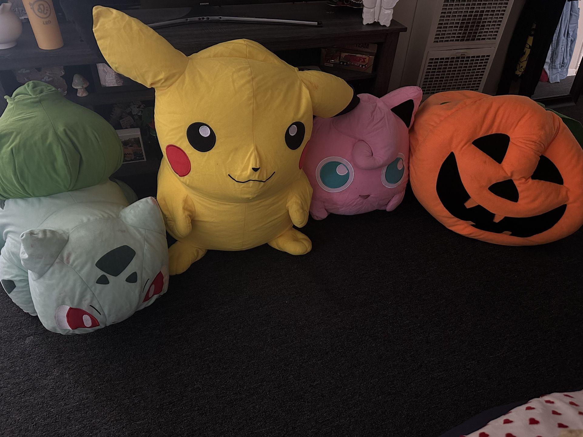Won these jumbo plushies at Knott’s Berry Farm and now looking to rehome them! Characters include: • Bulbasaur • Pikachu • Jigglypuff • Pumpkin Jack-o’-Lantern (perfect for Halloween vibes!) Condition: All are in good shape except Bulbasaur, which has some chalk marks (can be cleaned) and a small tear in the back that needs stitching. Price: $20 each – open to all offers, so feel free to shoot your shot! Montebello pick-up only.