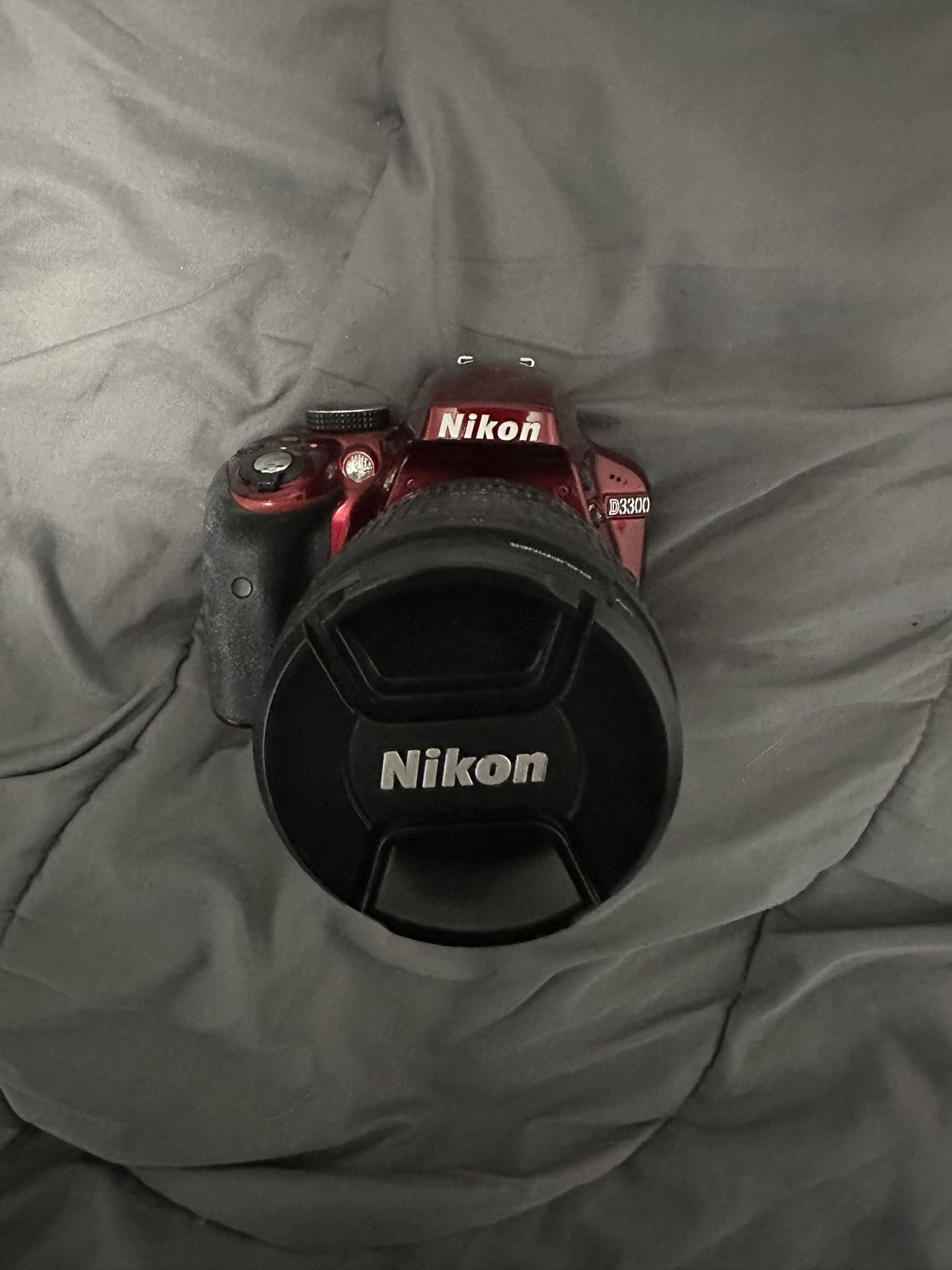Cherry Red Nikon D 3300 with 18-70mm lens, battery and charger, memory card and bag. Excellent condition. Cash only, no trades.
