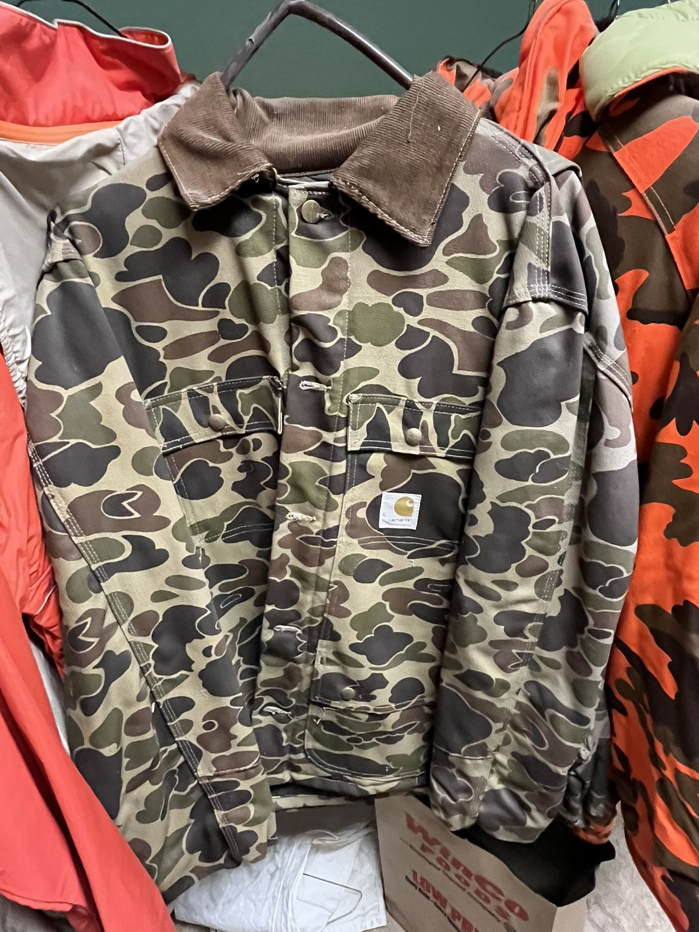 New green camo hunting jacket with detachable hood . VGC $80