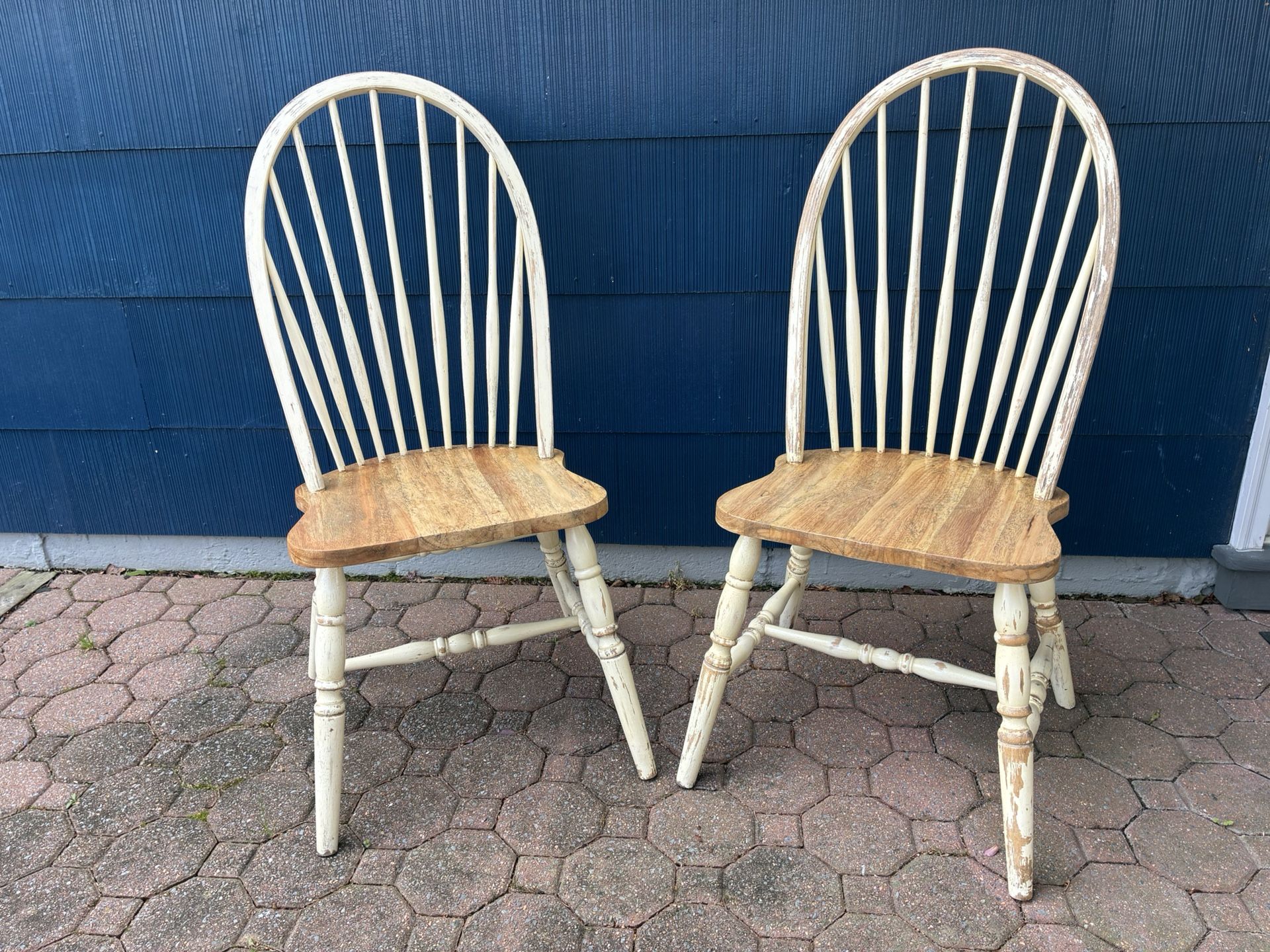 2 rustic farmhouse style wood chairs with spindle backs.