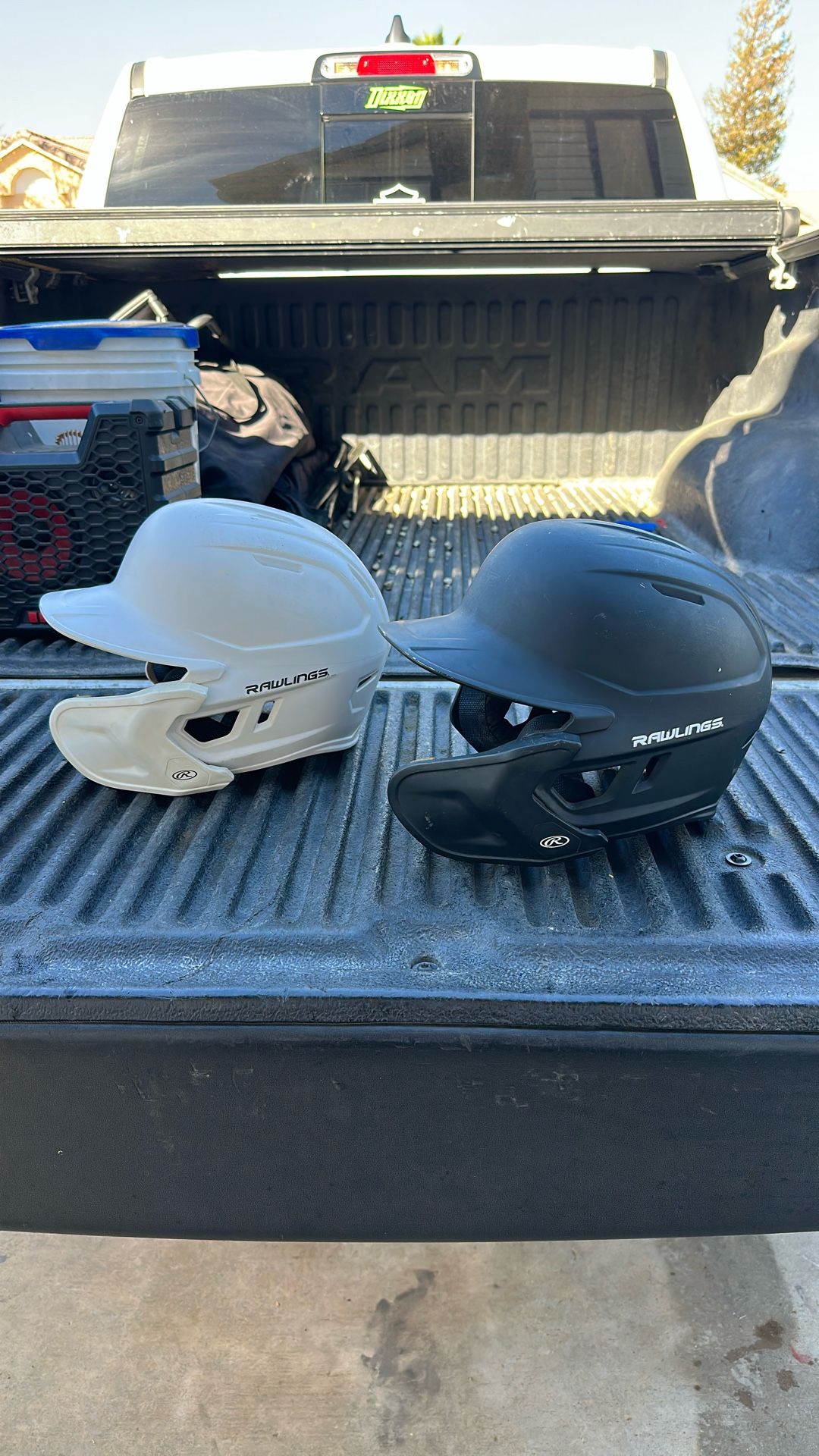 2 Rawlings Mach Jr Rev batting helmets One white one black both with adjustable face guard Both same size JR fits most kids 12under Great shape no major scuffs and all padding still intact These are $85 helmets selling for $40ea