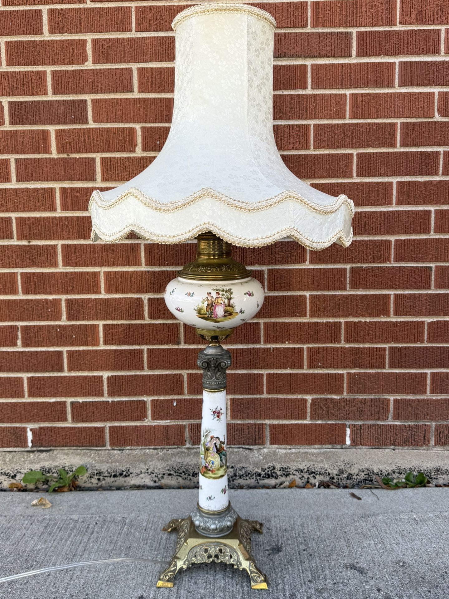 Up for your consideration is this amazing antique lamp! It is stunning in person (the pictures don’t do it justice and it comes with a really fun shade or you could change it out for a new one. Someone definitely worked to convert this from the oil lamp it was originally and needs to be tightened. But it’s in beautiful shape and the base is heavy! Please ask if you have any questions! Dimensions: 41”h x 8.5”L at base. Shade diameter at base 18” Driveway/porch pick up, Cash only. No holds. No returns - please inspect before buying. Delivery available in the near surrounding areas for an additional fee! We can get it to a driveway or garage, but not inside of a home. Please take a look at my other items for sale if you are interested - always willing to bundle items for a good price! Thank you for looking!