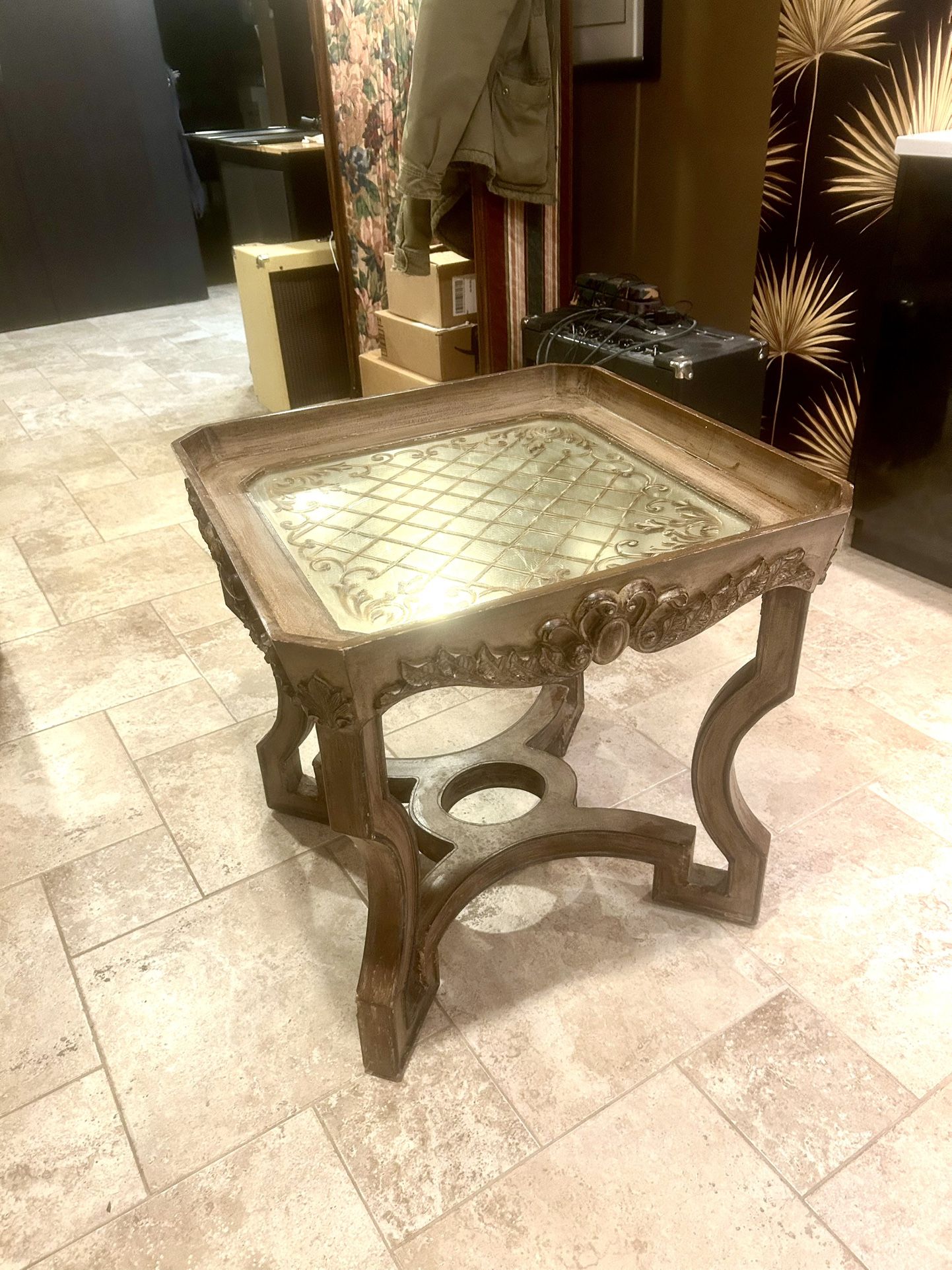 Absolutely beautiful and sturdy pecan colored carved wood end table with decorative mirror top. Measures 35.75” square and 26” high