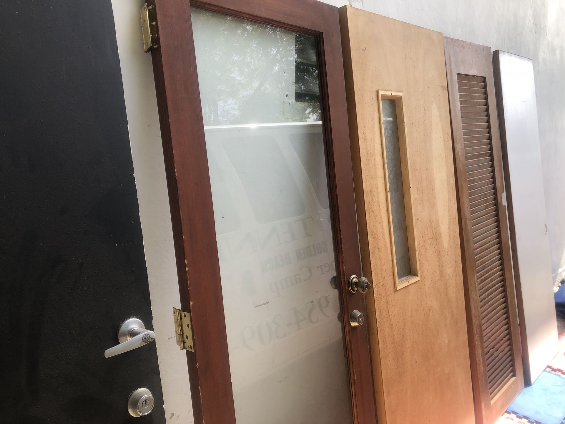 8 doors for sale New School room door. 30 by 79. With the small textbook door. $60 Wood and glass door was in recording studio before. 30 by 79. Good sound proof. $50 Includes lock and key Solid wood door. With lock and key. $40 Wood pocket door with wood slats. $20 Wood pocket door for closet. $15 Roofers wood ladder. Used for ladder for a loft. Never outside Contractors. $4000 of solid oak kitchen cabinet doors. Drawers and trim 43 doors. 12 drawers and 3 boxes of trim I’m moving and would rather not take with me will sacrifice for $350
