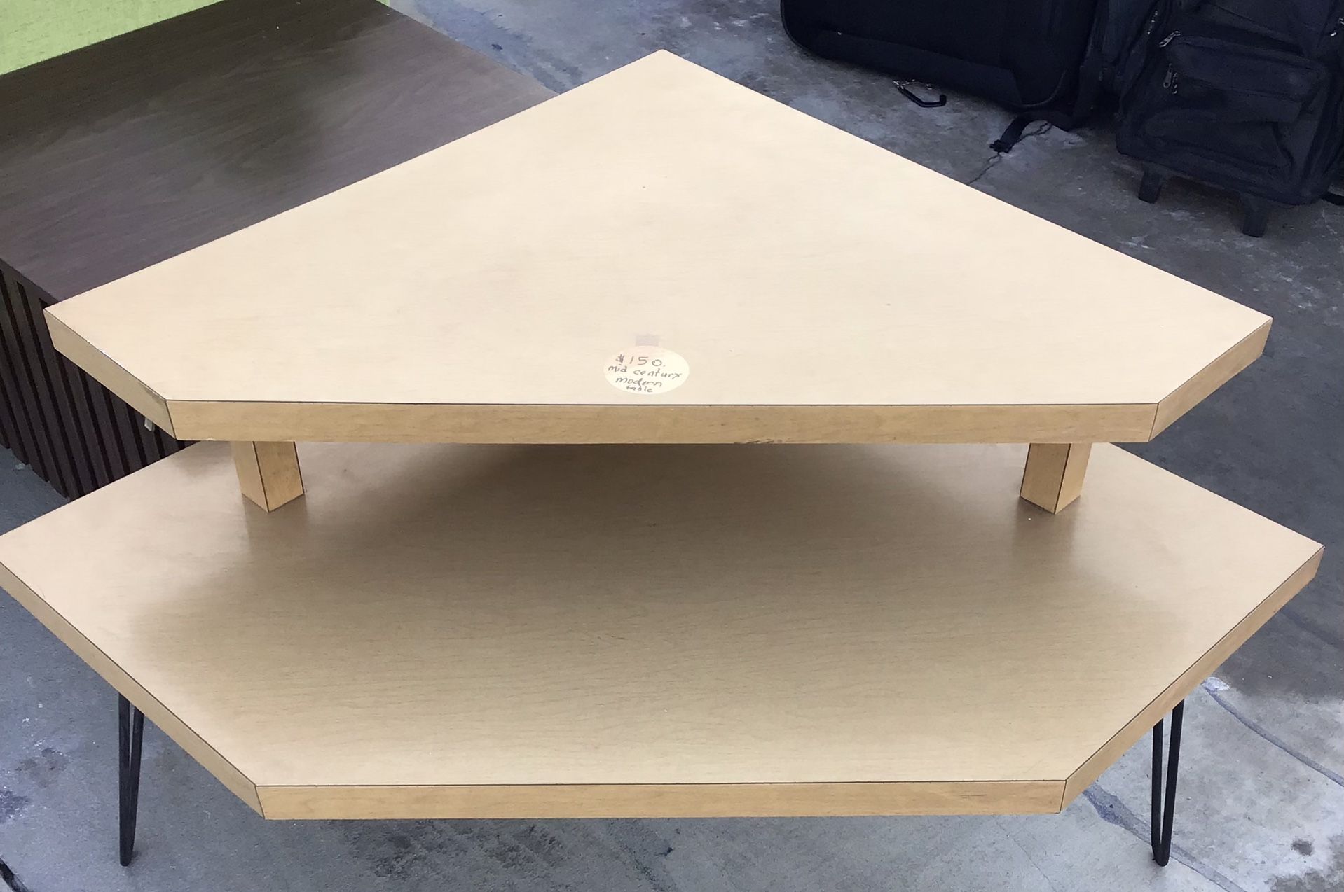 25 in. x 45 in. x 35 in. light brown wood corner table with two areas to place items. All sales are final, no returns, exchanges, or refunds