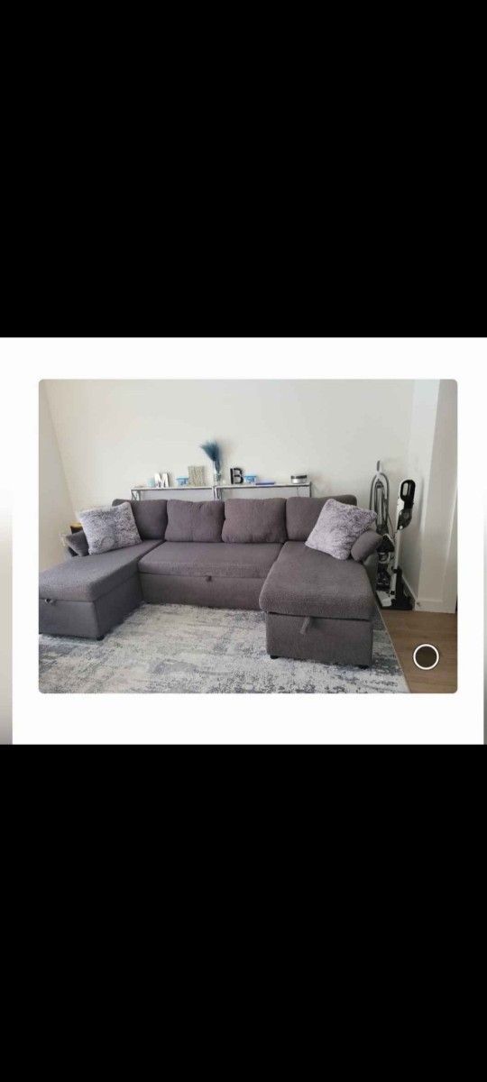 Need this gone ASAP to clear space! This is a massive, highly functional U-shaped sofa that doubles as a guest bed and has tons of hidden storage. 🔥 TOP FEATURES: Pull-Out Sleeper: Center section slides out easily to create a huge, flat sleeping surface—perfect for movie nights or guests. Double Storage: Both side chaises lift up to reveal deep storage for blankets, pillows, or clutter. Dimensions: 110” Wide (Spacious 4-5 seater). Fabric: Durable, soft Charcoal Grey Bouclé (easy to clean). Condition: Excellent/Like-new. Pet-free and smoke-free home. 💰 UNBEATABLE DEAL: Paid over $1,100 new. My Price: $400 (First come, first served). 🚚 PICKUP INFO: Easy Transport: Breaks down into modular pieces for easier moving. Location: Katy/Fulshear Availability: Must be able to pick up. Message me now if you’re ready to pick up today!