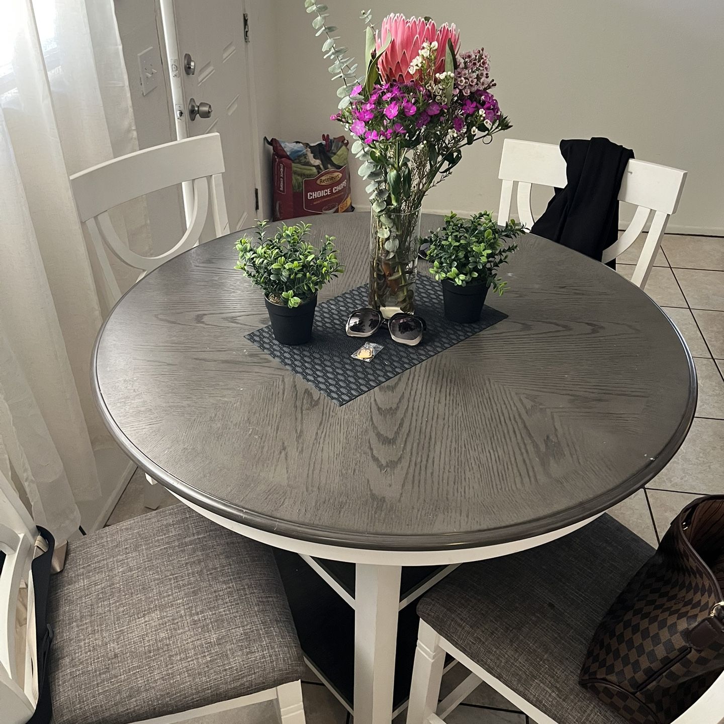 Pub height, table and chairs. Approximately one year-old. Has a few minor marks at the top that you can barely see, but they are included in the pictures and comes with four chairs. Best offer. Must pick up no delivery.