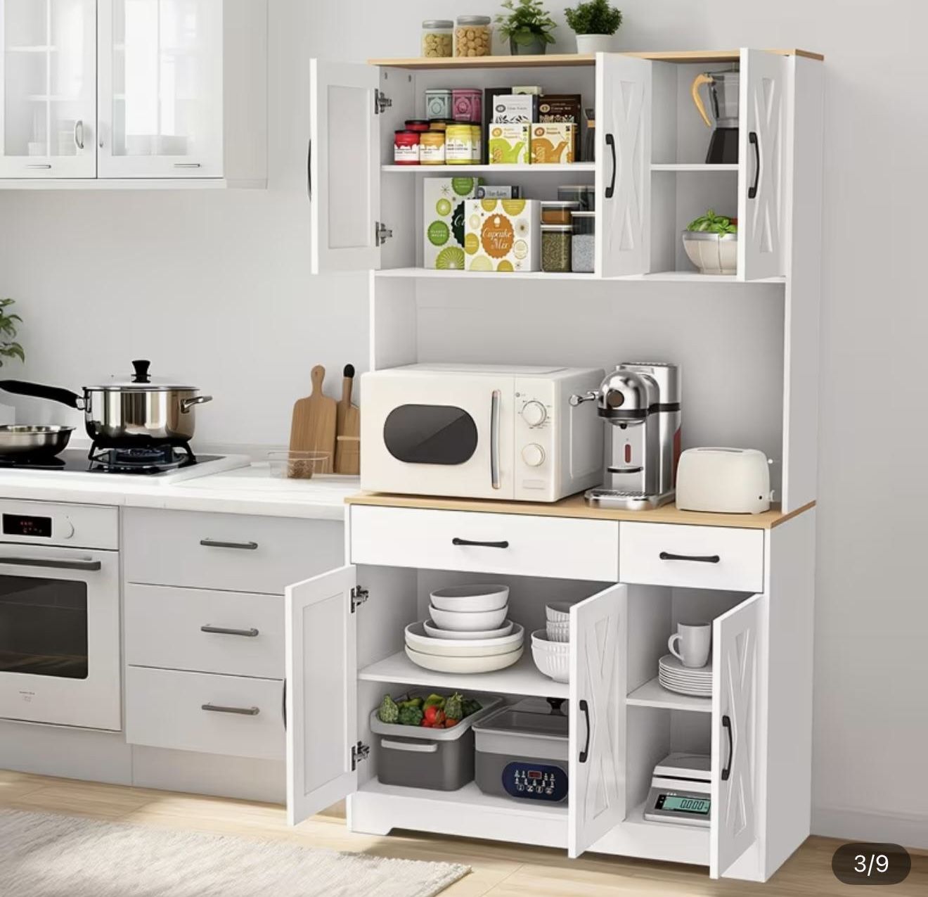 Brand New Kitchen Storage Cabinet / Pantry Hutch – In Original Box Modern and functional kitchen storage cabinet, brand new and unused, still in its original packaging. Finished in classic white with a natural wood-style countertop, perfect for kitchens, dining areas, pantries, or apartments. This versatile storage unit features multiple cabinets and compartments to keep your space clean and organized. Ideal for storing dishes, pantry items, small appliances, or household essentials. Features: • Upper and lower cabinets with doors • Adjustable interior shelves for customizable storage • Spacious countertop for microwave, coffee maker, or appliances • Built-in charging station with 2 AC outlets (120V/12A) and 2 USB ports (5V/2A) • Anti-tipping design for added safety • Sturdy and stable construction • Clean, modern farmhouse-style design Multiple uses: Perfect for use as a kitchen pantry, microwave stand, coffee bar, dining room storage, bedroom cabinet, or utility storage unit. 📏 Overall Dimensions (approx.): • Height: 67 in (170 cm) • Width: 37.6 in (95.6 cm) • Depth: 14.5 in (37 cm) 🆕 Condition: Brand new, never used, in original box. Assembly required. Great solution for anyone needing extra storage with a stylish and practical design.