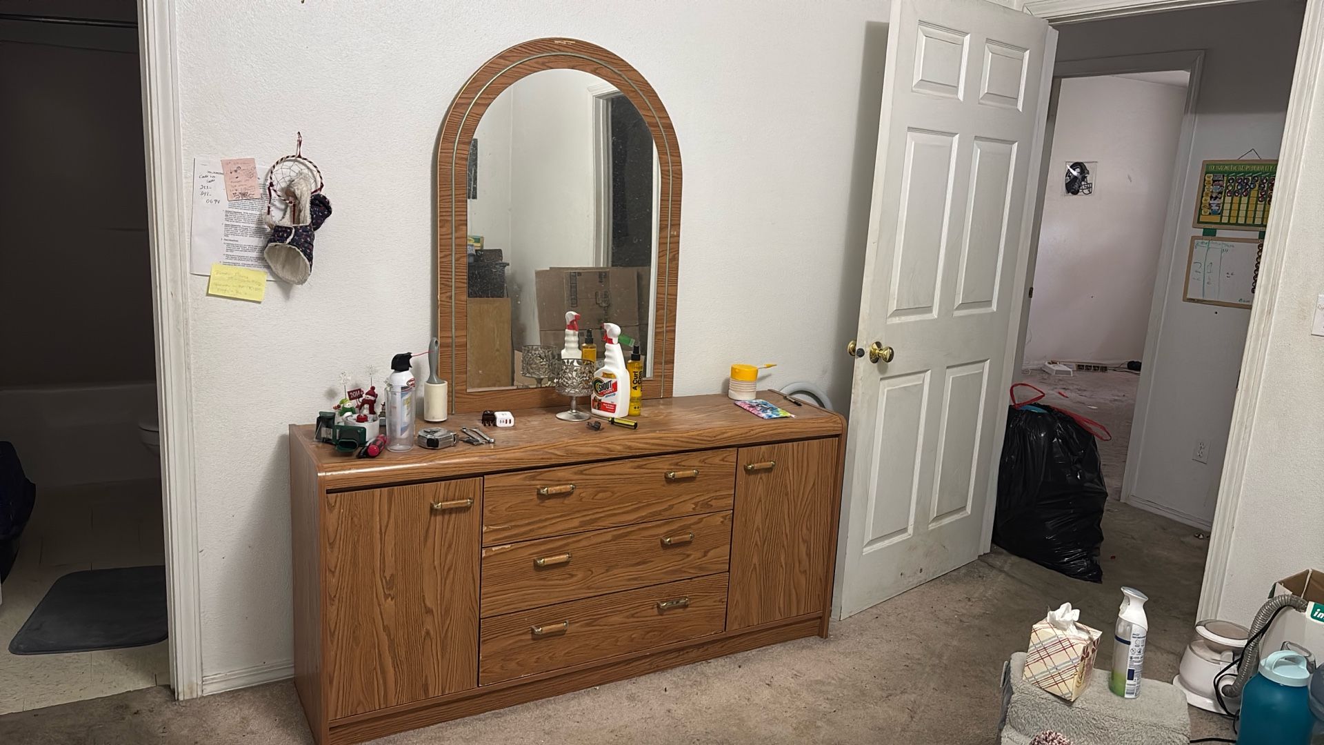 Dresser with mirror it is 61.25 inches long. Free come and get it. First person to get. It can have it. I'm not messing around with. I'm gonna get it. I can't get it till tomorrow. Whatever I need it gone now. So come get my dresser and enjoy it. Whatever there's nothing wrong with them. The drawers, opening clothes. It has minor flaws, but nothing serious. It's a great dresser. Plus what makes it even great. Is it free? Please come get it.