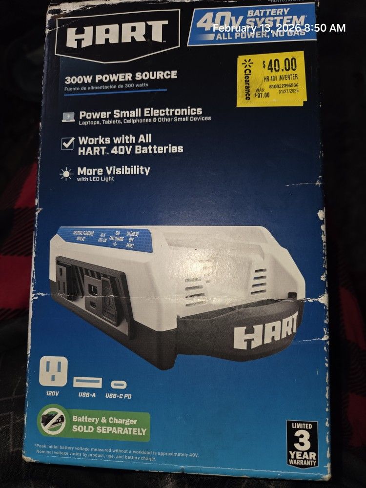 Selling a HART 40V 300W Power Source — brand new, only opened to check contents. Perfect for camping, power outages, tailgating, or running small electronics anywhere. Works with all HART 40V batteries. Features: - 300W max output - 120V AC outlet - USB‑A Fast Charge + USB‑C PD - Powers laptops, tablets, phones, lights, and small electronics - Built‑in LED light for emergencies - Carry handle for easy grab‑and‑go - Compatible with every HART 40V battery (battery not included) Condition: New/open box. Never used. Clean and ready to go.