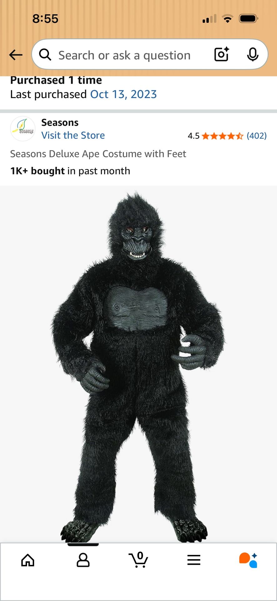 High-quality ape costume with feet, perfect for Halloween.