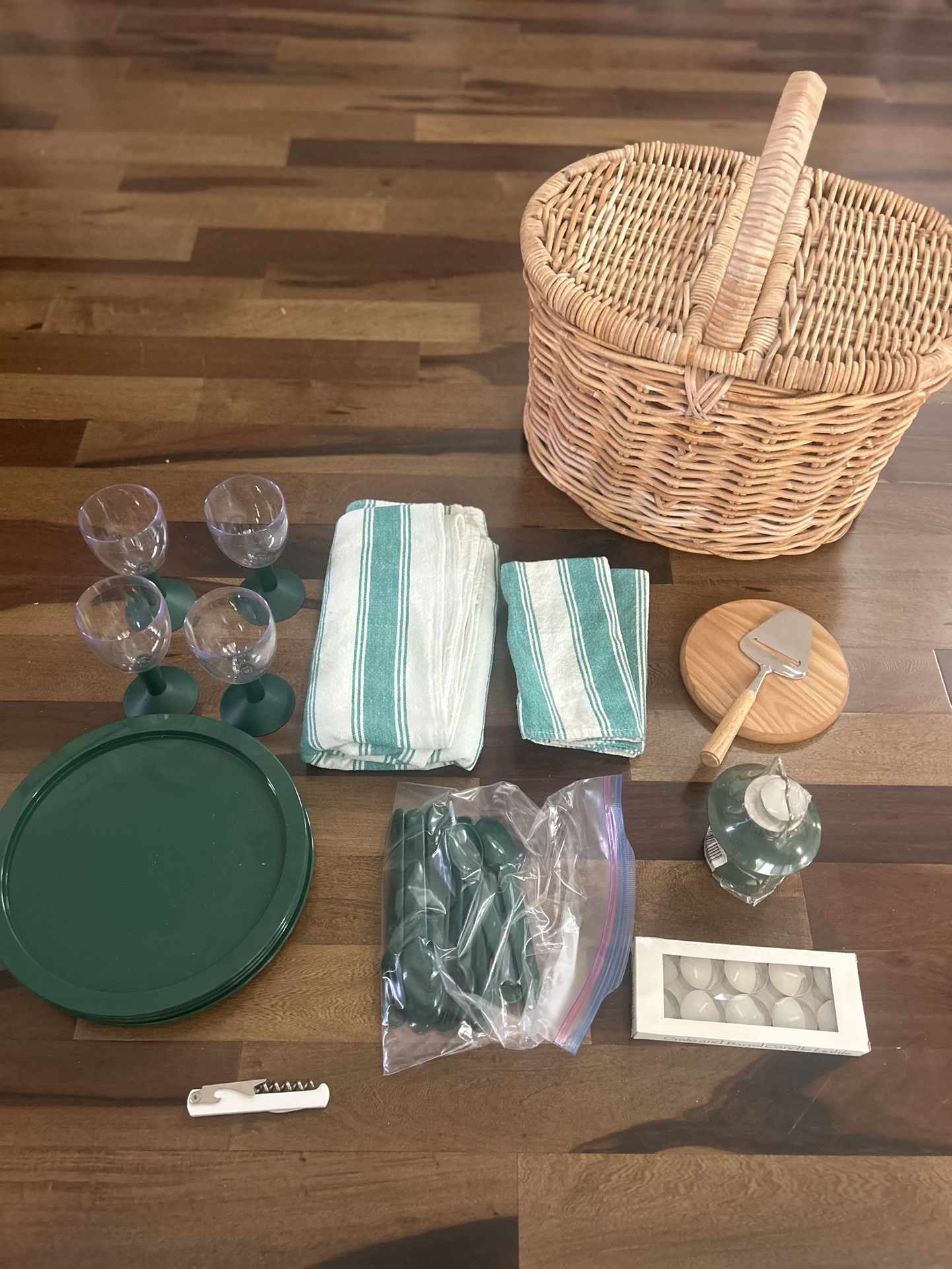 Never used picnic set. Comes with napkins, tablecloth, 4 cups and plates, utensils, cheese board and knife, bottle opener, lantern with extra candles