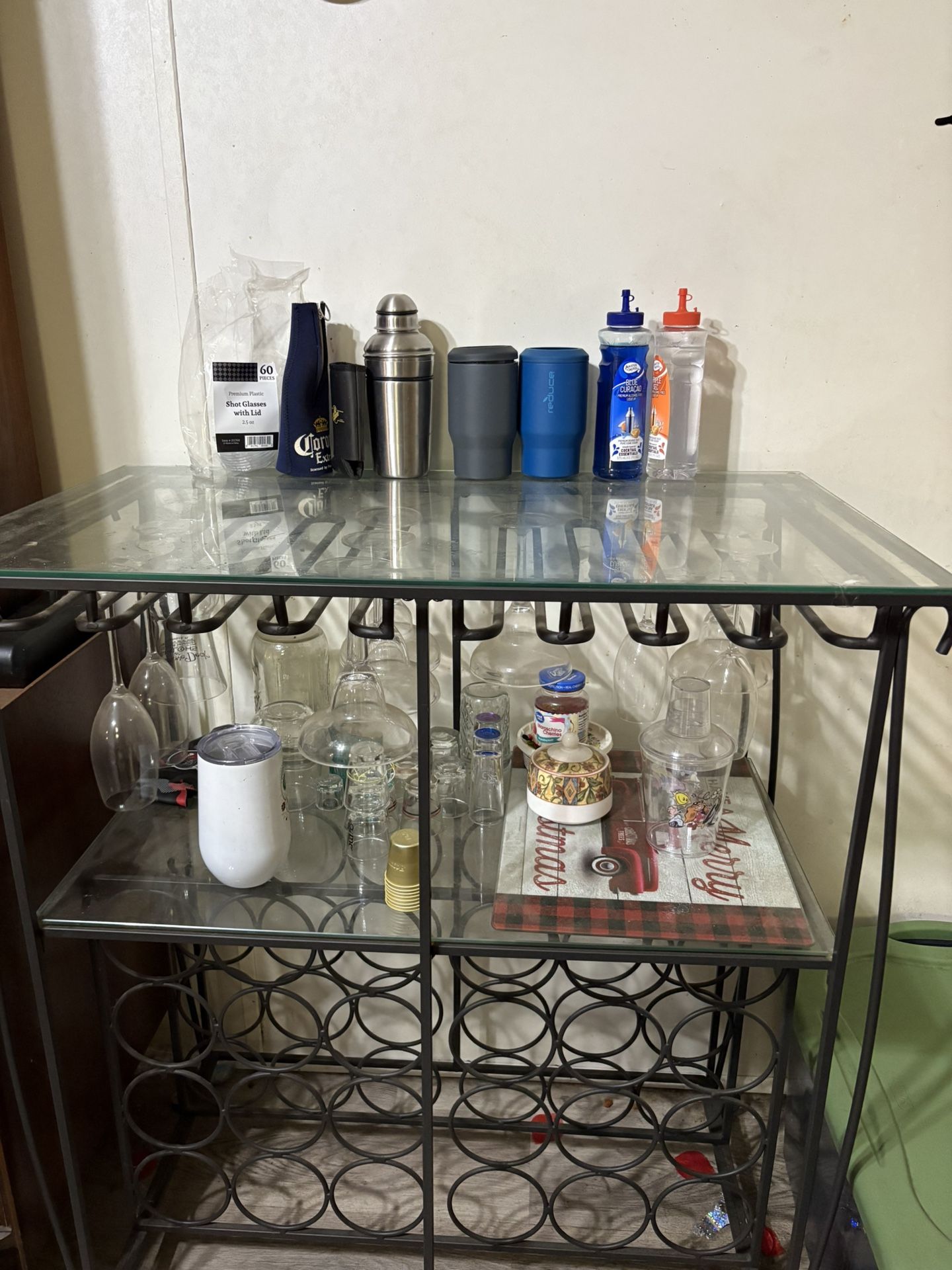 Used but great condition Holds and comes with wine and margarita glasses plenty or storage glass top
