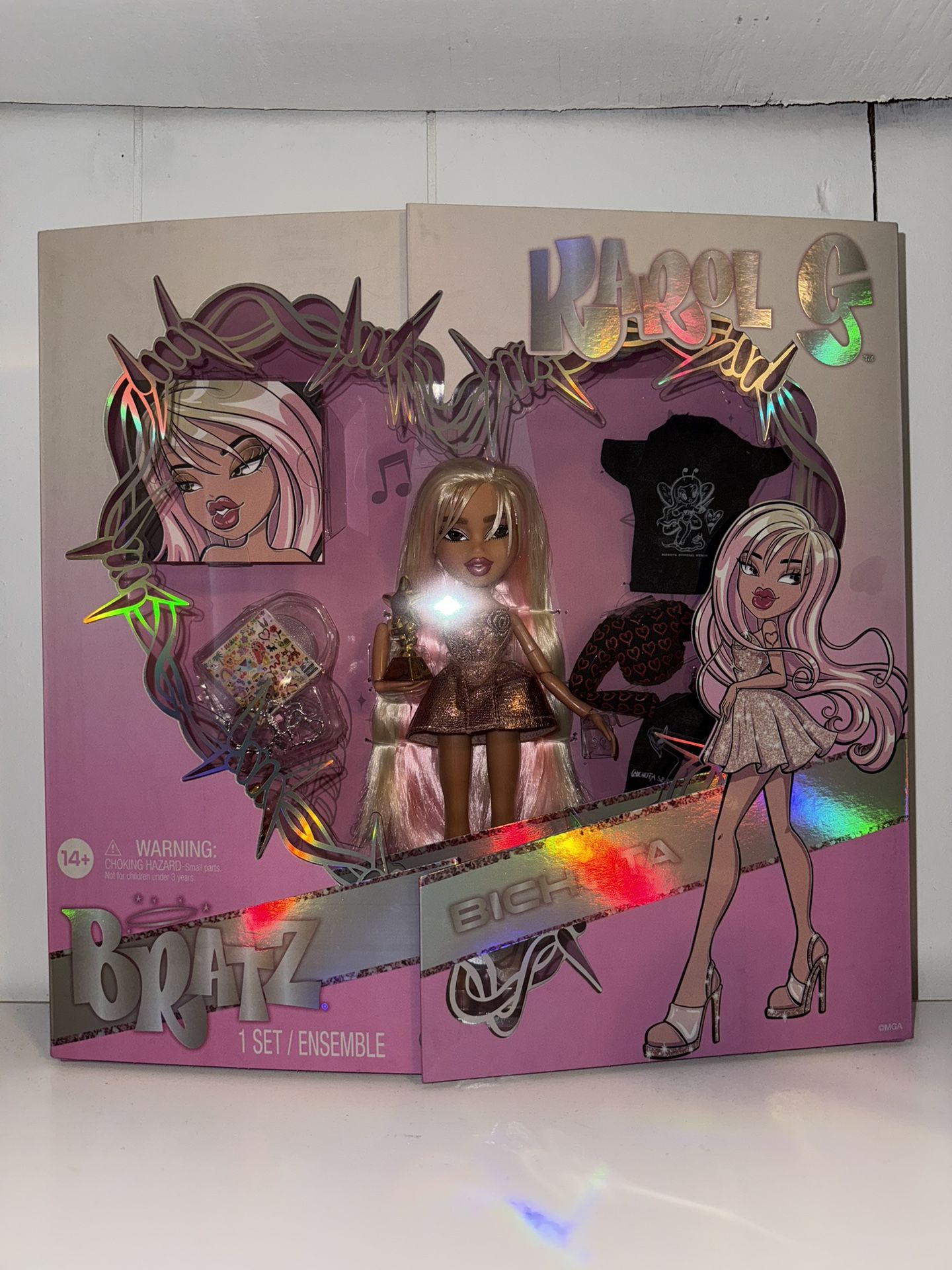 Original Karol G X Bratz Doll - The Karol G Bratz Doll rocks an award-winning look, wearing a metallic bustier dress with delicate detailing, inspired by her iconic award show outfit. She also comes with a bichota, acid wash t-shirt dress and sweatpants—based on her real merch so you can twin with your Bratz x Karol G doll. Additionally, she comes with a long sleeve crop top with red hearts.
