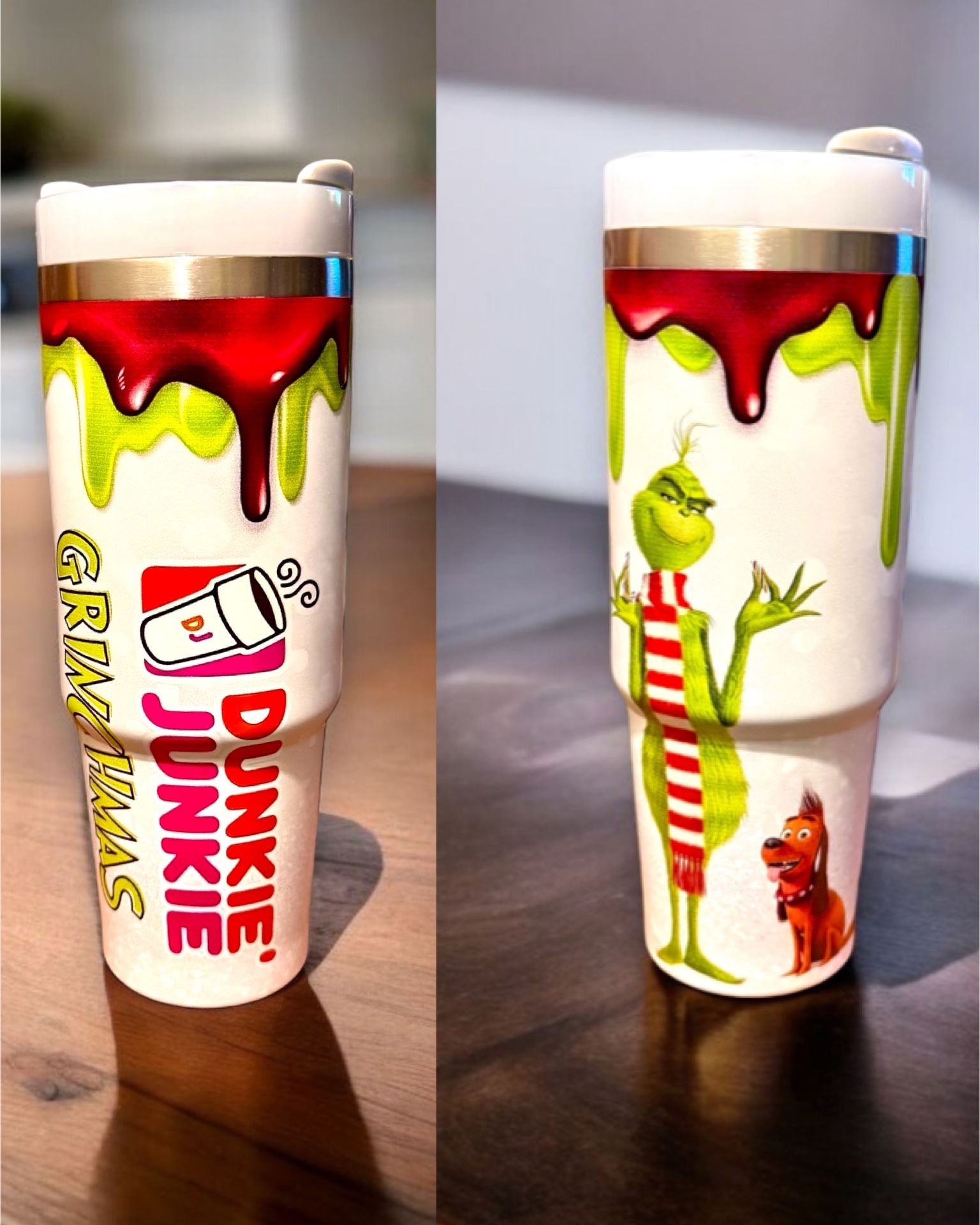 Super cute 30oz Grinch Christmas, Grinchmas, travel tumbler. Great for hot or cold liquids (comes with straw and has sip lid) Dunkin (This is for 1 tumbler) if you’d like more message me