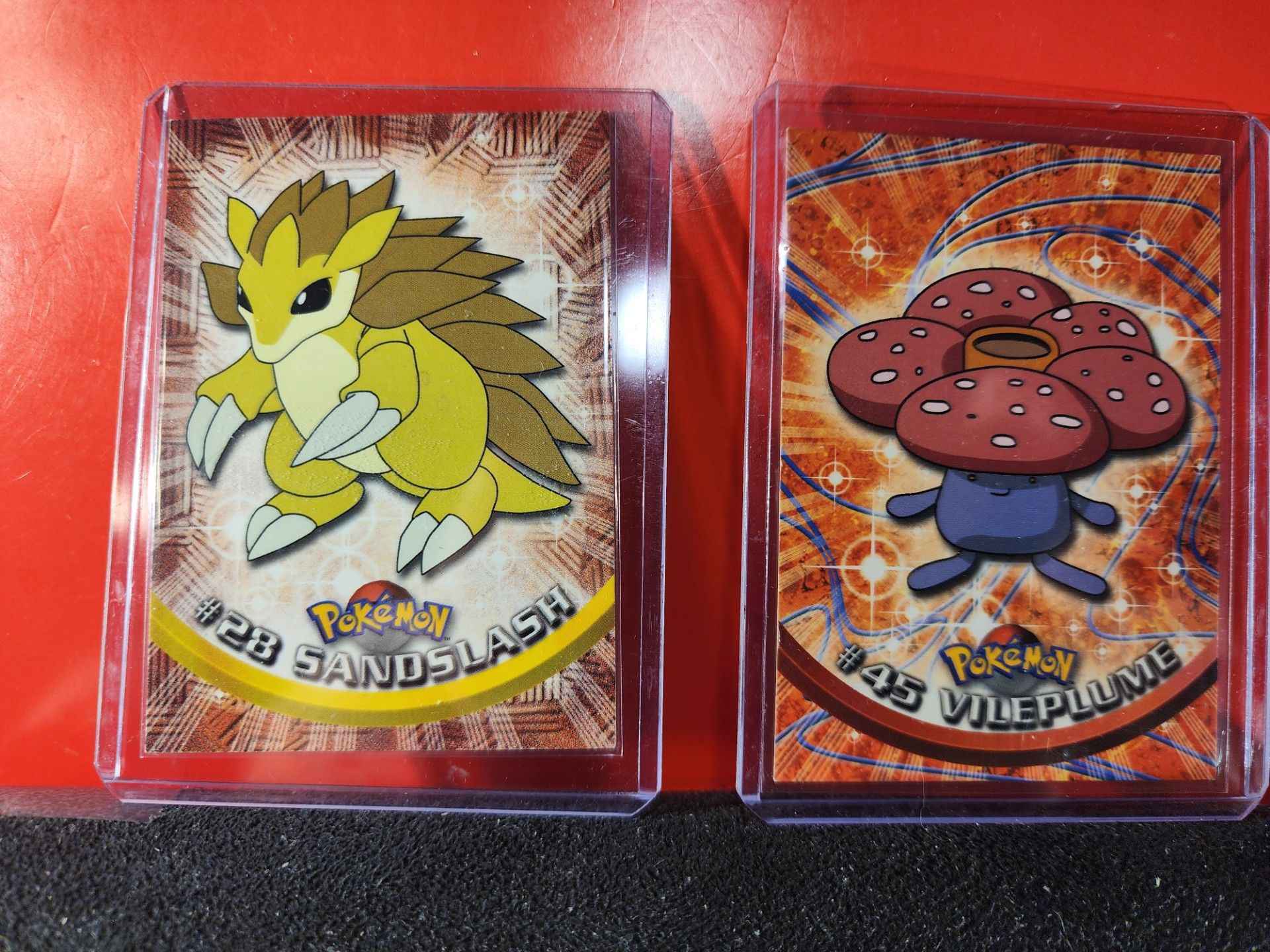 This item is 2 1999 Topps Pokémon TV Animation Edition Series 1 #28 Sandslash and #45 Vileplume card, It is a Ground-type Pokémon card from the mouse category. The card is from the first series of Topps Pokémon trading cards.