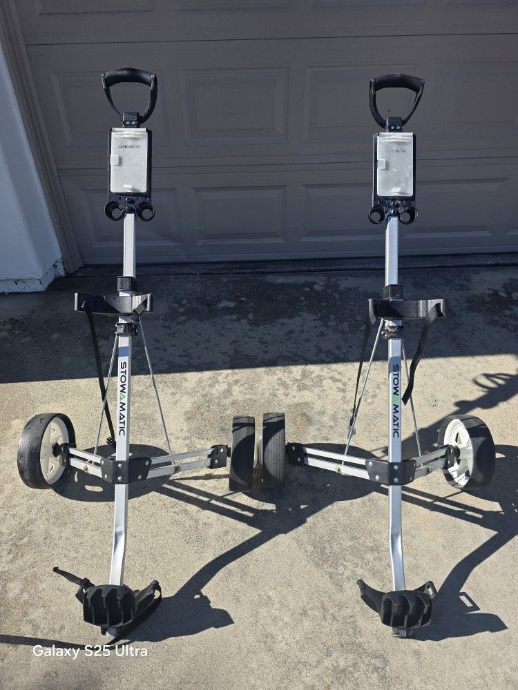 Two light weight aluminum frame pull/push golf carts in good condition.