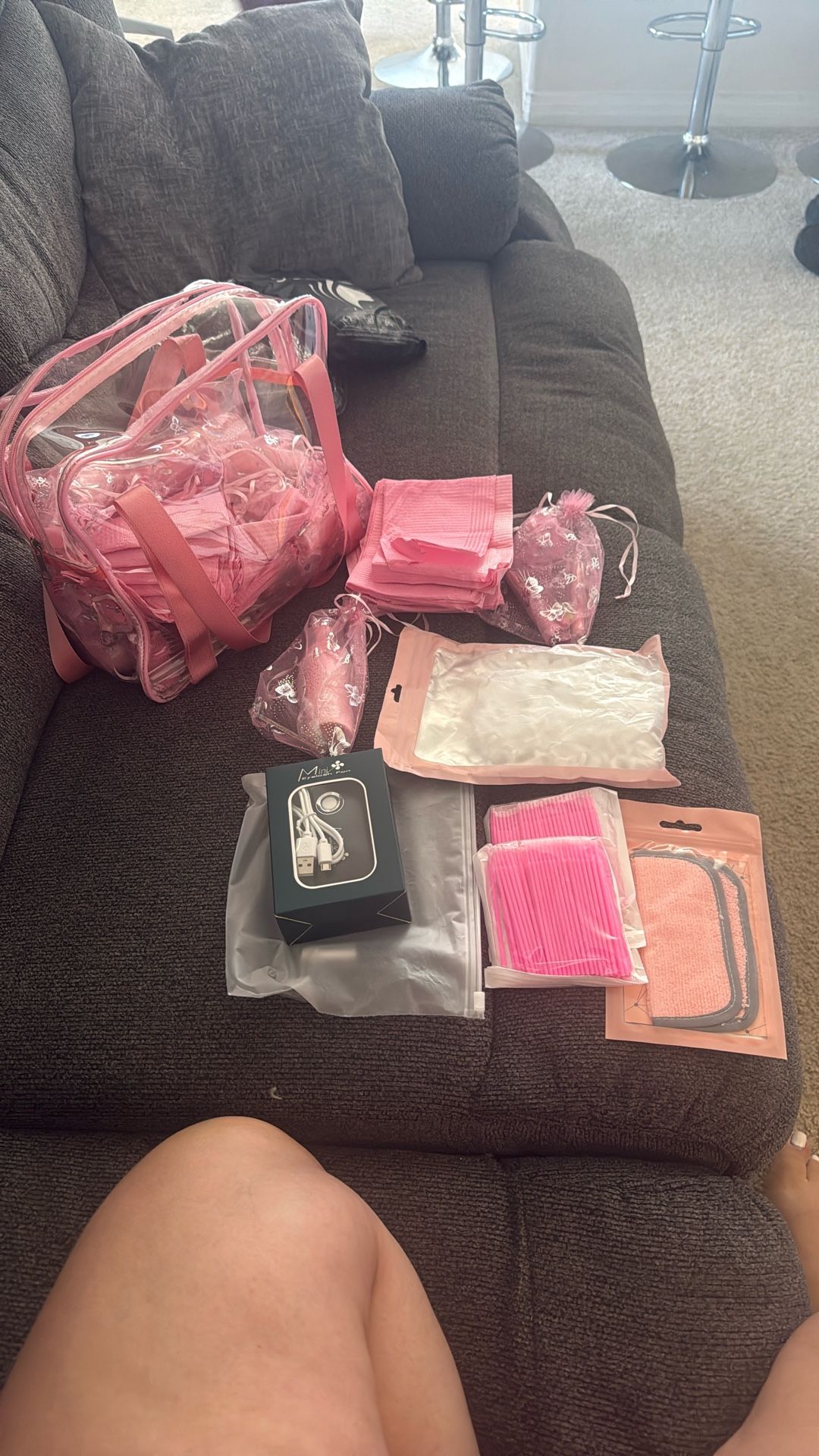 All eye extension supplies need to be gone. All of it in one medium size transparent purse/bag selling for $25. 1 usb fan 1 cloth 2 bag of eyelash brush 2 bags of eye extension tips 12 shampoo bottles with pink bag gifts.