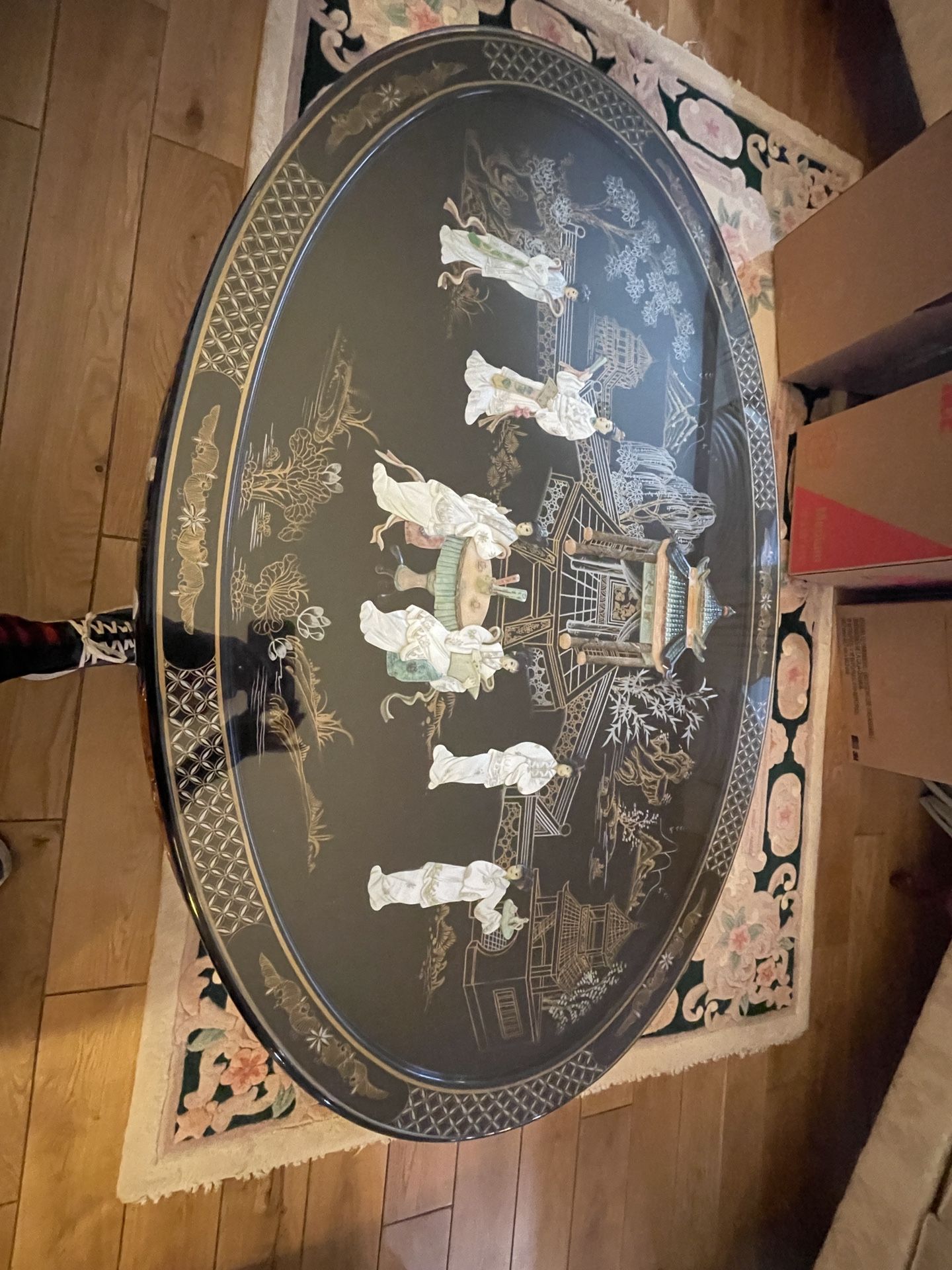 Beautiful Chinese lacquered coffee table set featuring intricate mother-of-pearl inlay with a traditional court scene. High-gloss black lacquer finish with elegant detailing throughout. Includes the oval coffee table and matching nesting stools (complete set). This is a statement piece—perfect for a living room, collector, or anyone who loves Asian-inspired or Chinoiserie décor. Very good condition. Inlay is intact, finish is glossy, and the set has been well cared for. 📍 Located in [your city] 🚚 Pickup preferred (can help coordinate loading) 💵 Cash / Venmo accepted Serious inquiries only. Reasonable offers welcome.