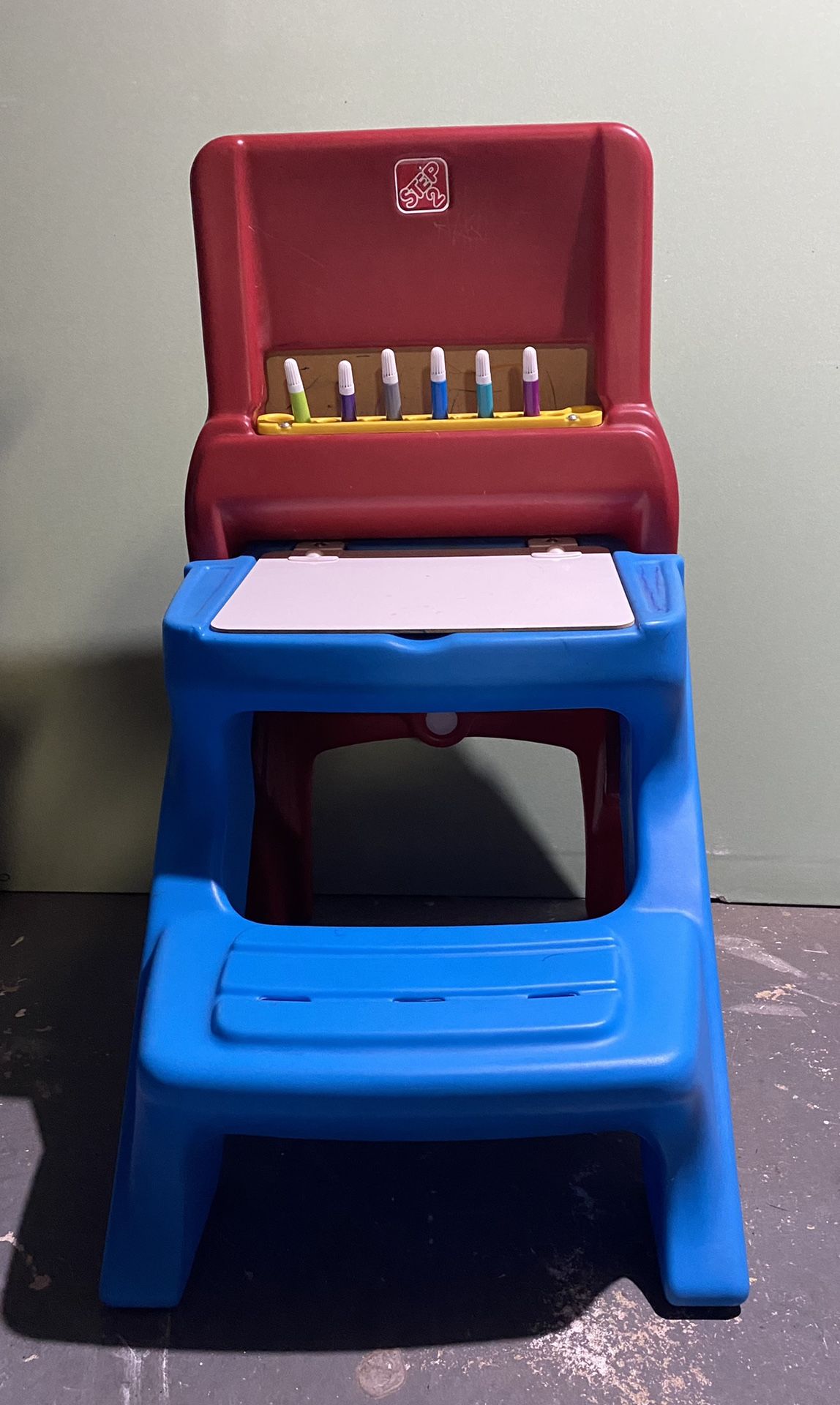 This toddler desk is ready for the next child. Sit and write, draw, paint. Desk lifts for storage. Easel on back side. My grandchildren enjoyed having their own space. Leaving their work and knowing no one would touch!