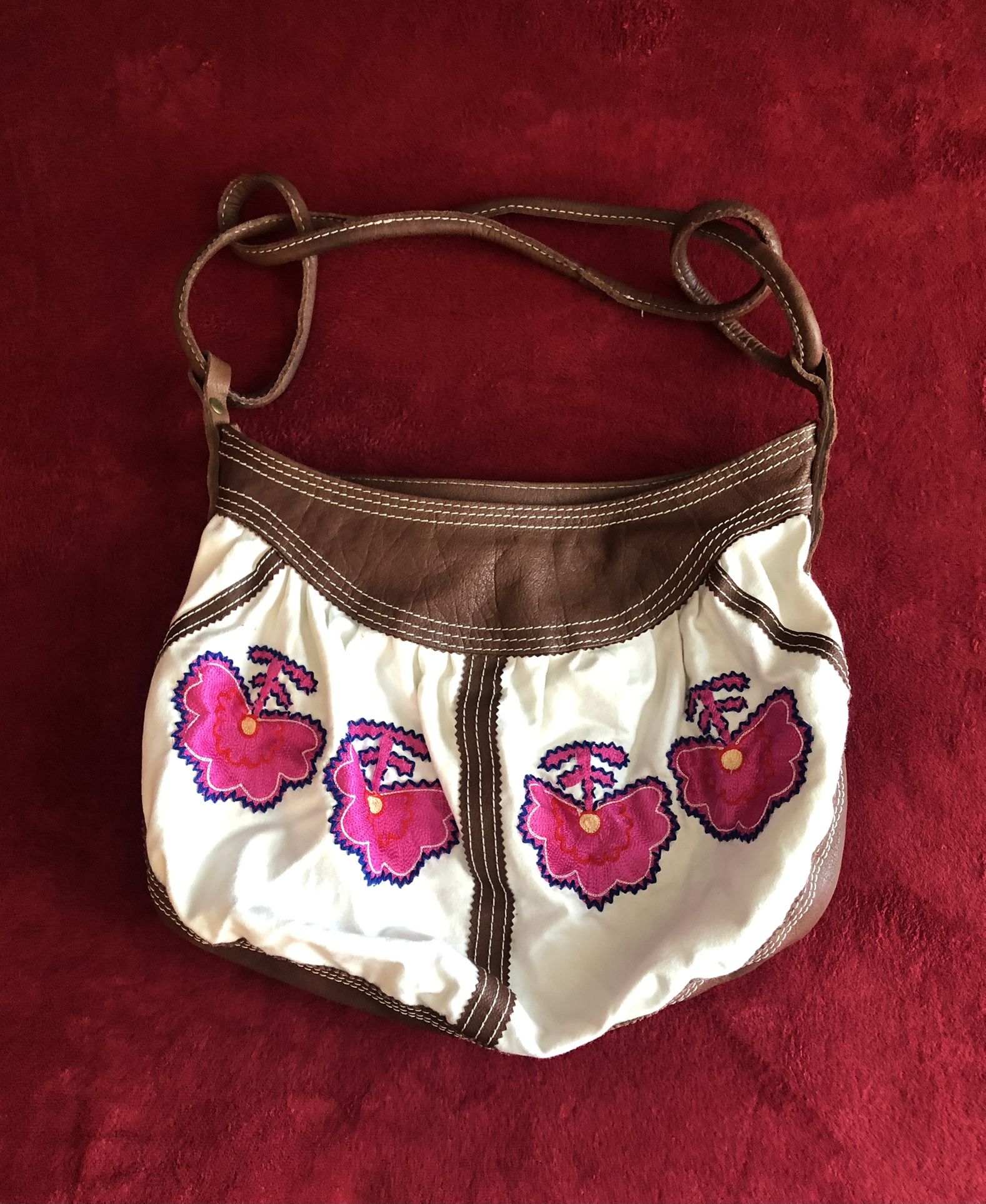 Very gently used bag. Main Zipper closure. Interior is clean w/o any pen marks or makeup. Interior zippered pocket. Off white color with embroidered flowers and fish. Strap is 29 in long 20x14 and very roomy Has a few minor dark spots on leather-see photos.