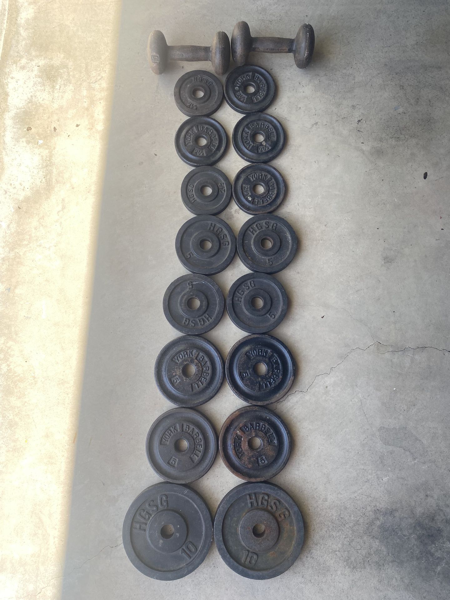 Metal Olympic weight plates. Assorted sizes from 2.5 pound to 10 pound plates. 2-10lb dumbbells. Only $1 per pound.