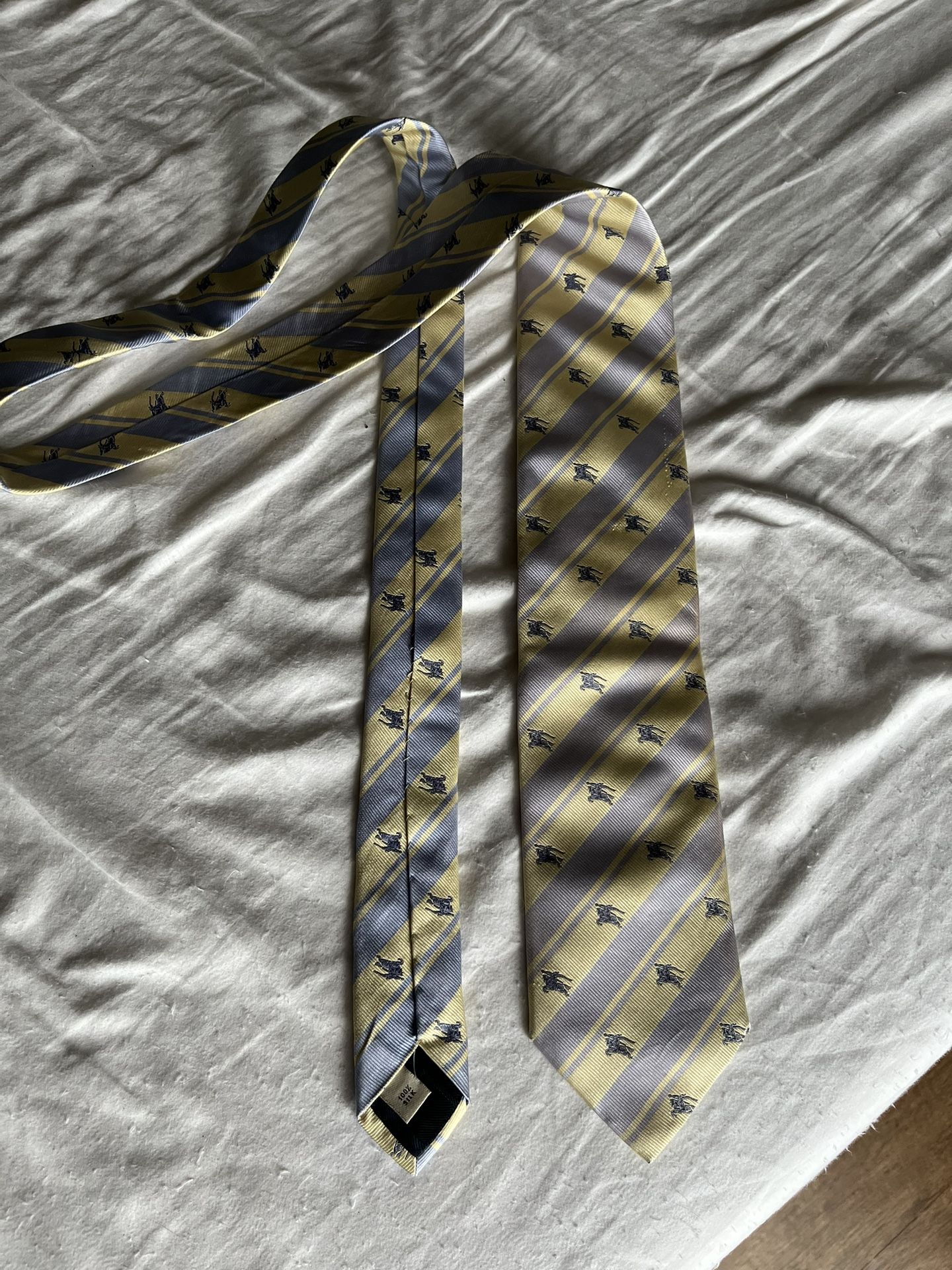 Vintage designer Burberry tie. Light blue and yellow with Burberry monogram embroidered throughout.