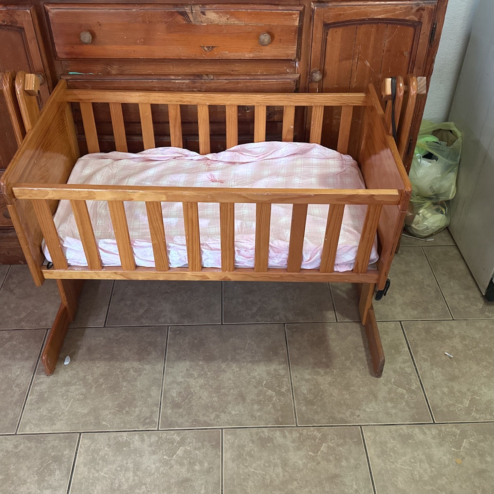 Wood bassinet got it as a gift but was never used asking for 150 OBO it is swinging one