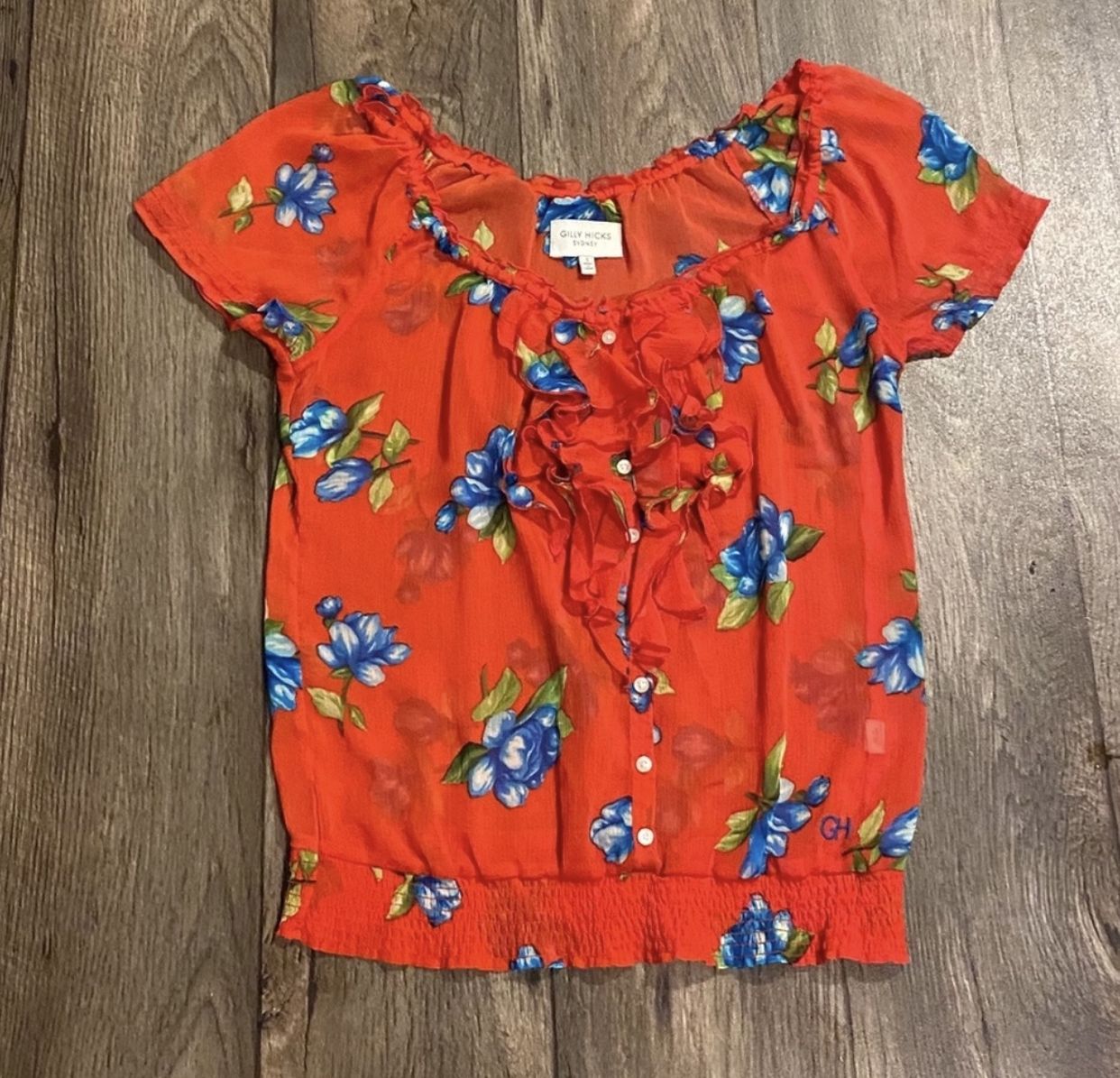 Vibrant red blue and green semi sheer ruffle blouse | shirt | top | tunic. Button front. Pit to pit is 16”, pit to hem is 15”. Size small. Polyester.