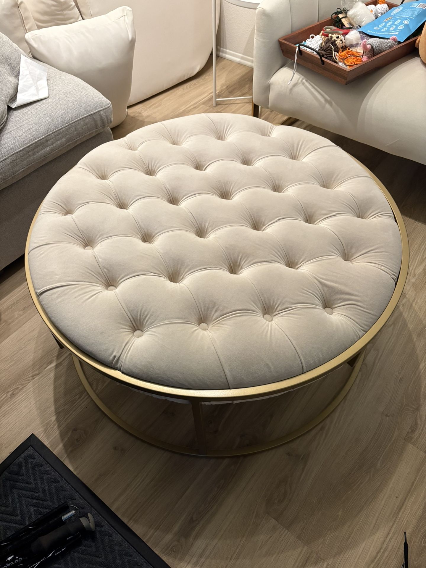Ivory velvet tufted ottoman. 38” diameter 19” height Originally paid $350. Like new condition.