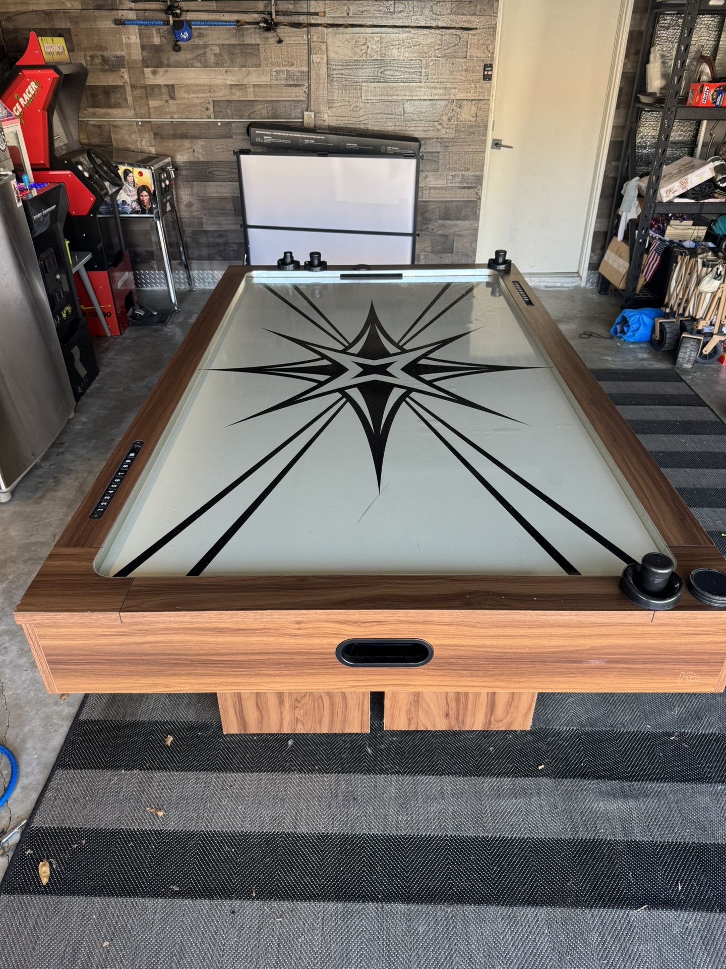 Full size air hockey table from Crate and Barrel. Originally over $1100. Kept in the garage for hours of fun, but shows some wear. Picture three shows some surface raising that has happened on the table, but does not affect game play. Has some dings, worst shown in the last picture. Still works great, all flaws cosmetic. Priced to move today.
