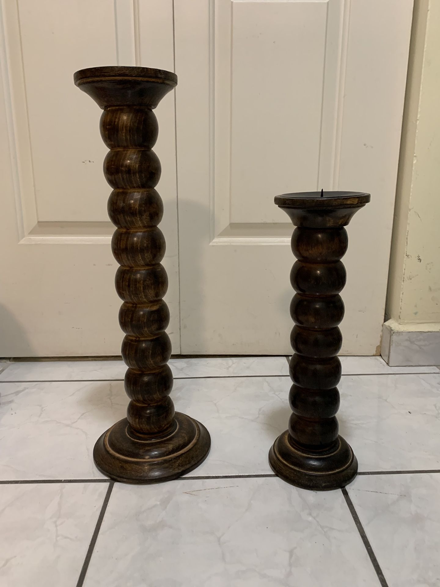 Two wood candle holders in very good condition. Brown color. $10 for the big one and $5 for the small one. Beautiful for decoration !
