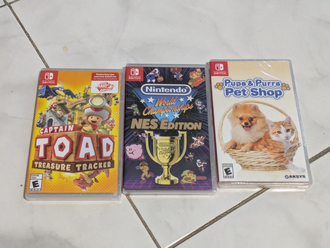 Selling three brand new sealed Nintendo switch games; Captain Toad Treasure Tracker, pups and purrs pet shop, Nintendo World Championships NES Edition Standard Edition