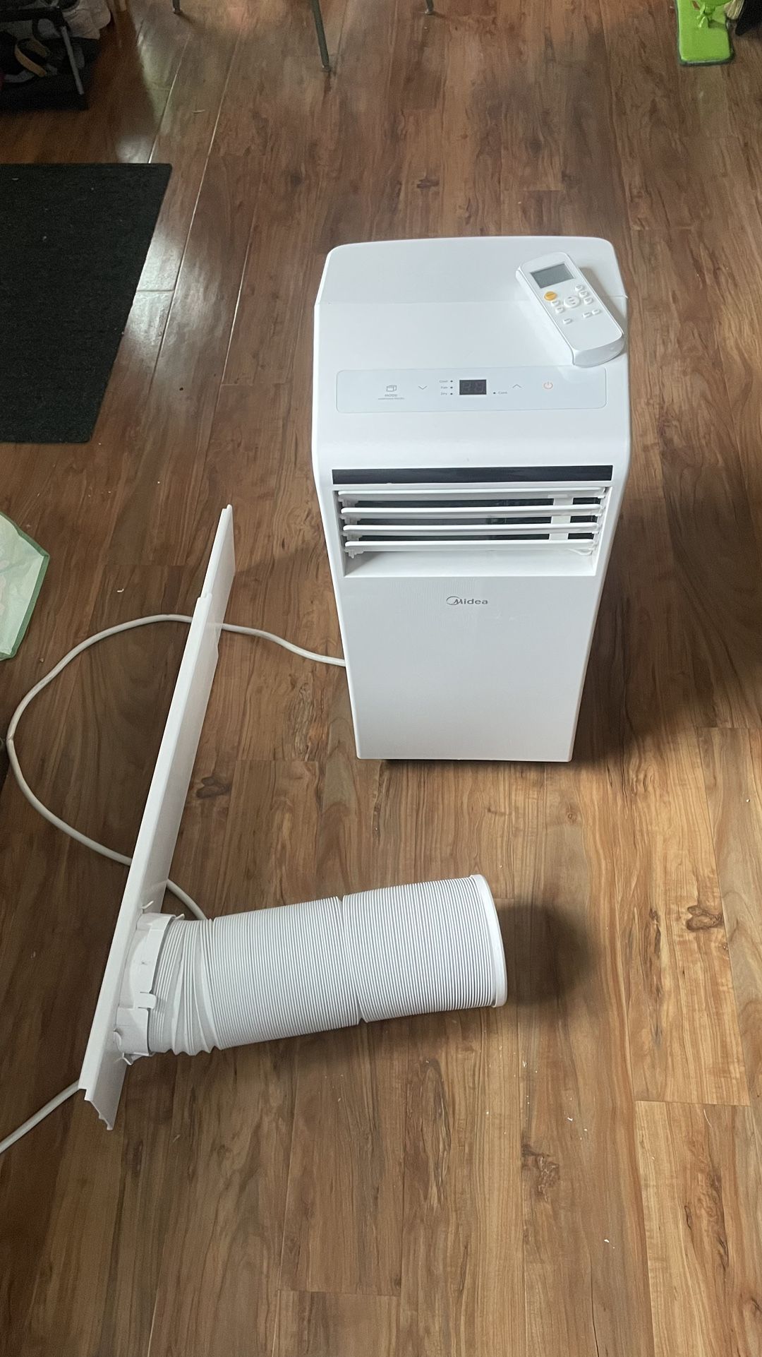 White Midea brand portable AC unit with remote and exhaust hose with window adapter. 8000 BTU/hr, with a timer and temp trigger settings.