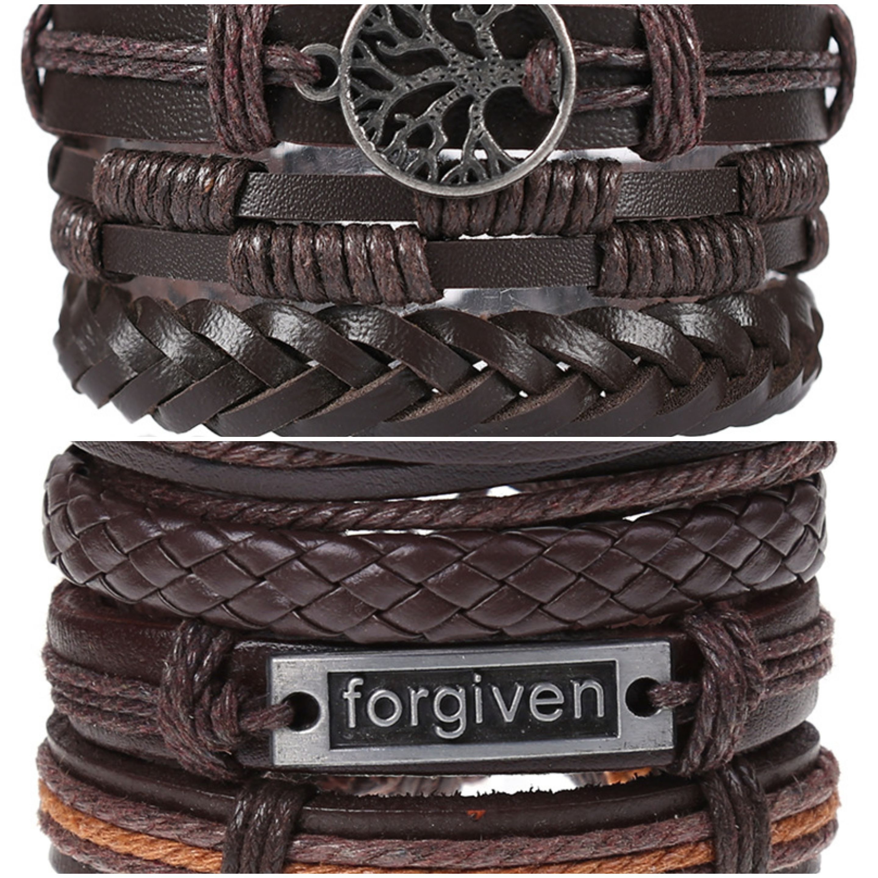 2 x Set Adjust. Size up to 9.5inc Leather Bracelet, Tree of Life (Brown-Forgiven)