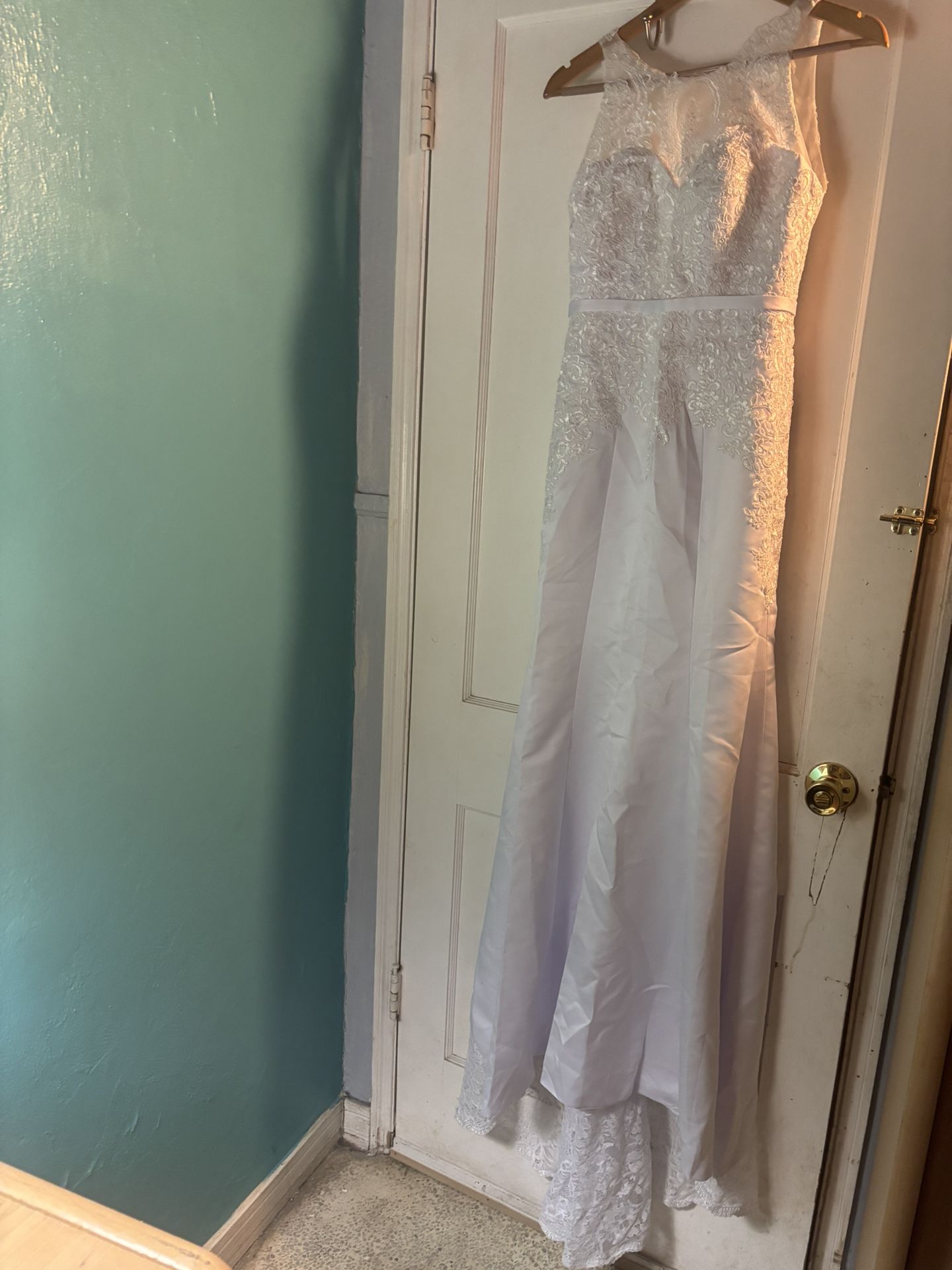 Very pretty and long white wedding dress with lace in the top and back of dress with ornamental buttons